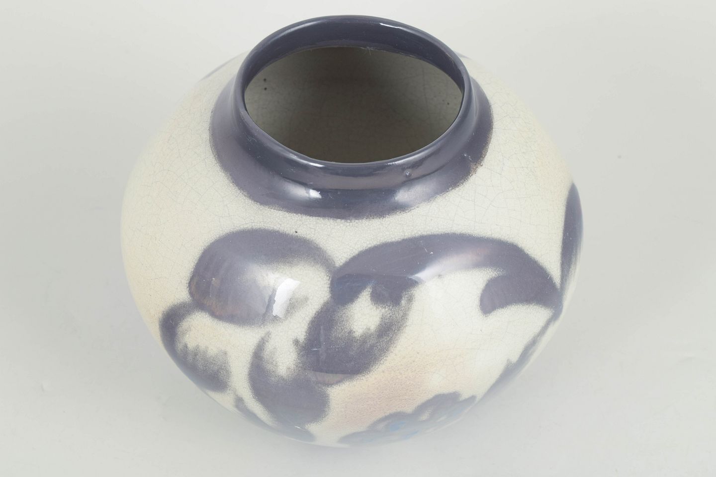 Organisk formet vase i keramik med blød, rund korpus og håndmalet dekoration i blåviolette nuancer på lys bund. Signeret EB under bunden.