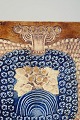 Dekorativt vægrelief i stentøj med stiliseret fuglemotiv i relief, udført i varme brune og blå nuancer med karakteristisk hånddekoreret mønster. Typisk for Lisa Larssons grafiske og folkloristiske formsprog fra 1970’erne.
