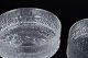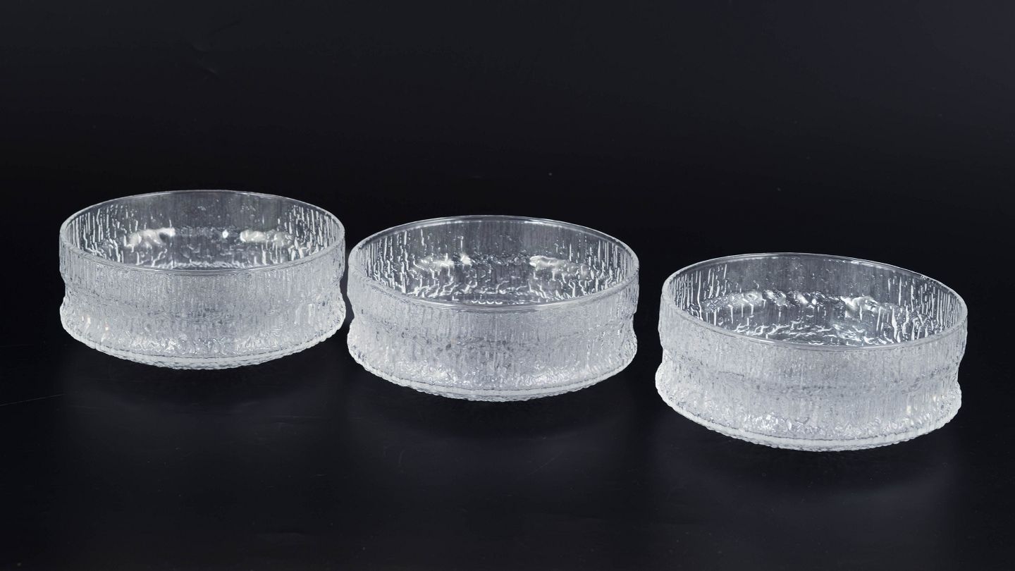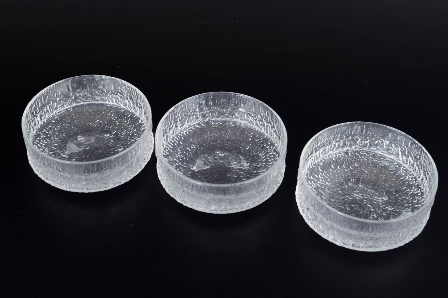 Set of three smaller pressed glass bowls featuring a distinctive organic texture and refined circular relief pattern. The design creates a beautiful interplay of light in the glass and represents a classic example of Finnish glass design. Hopla model in clear glass.