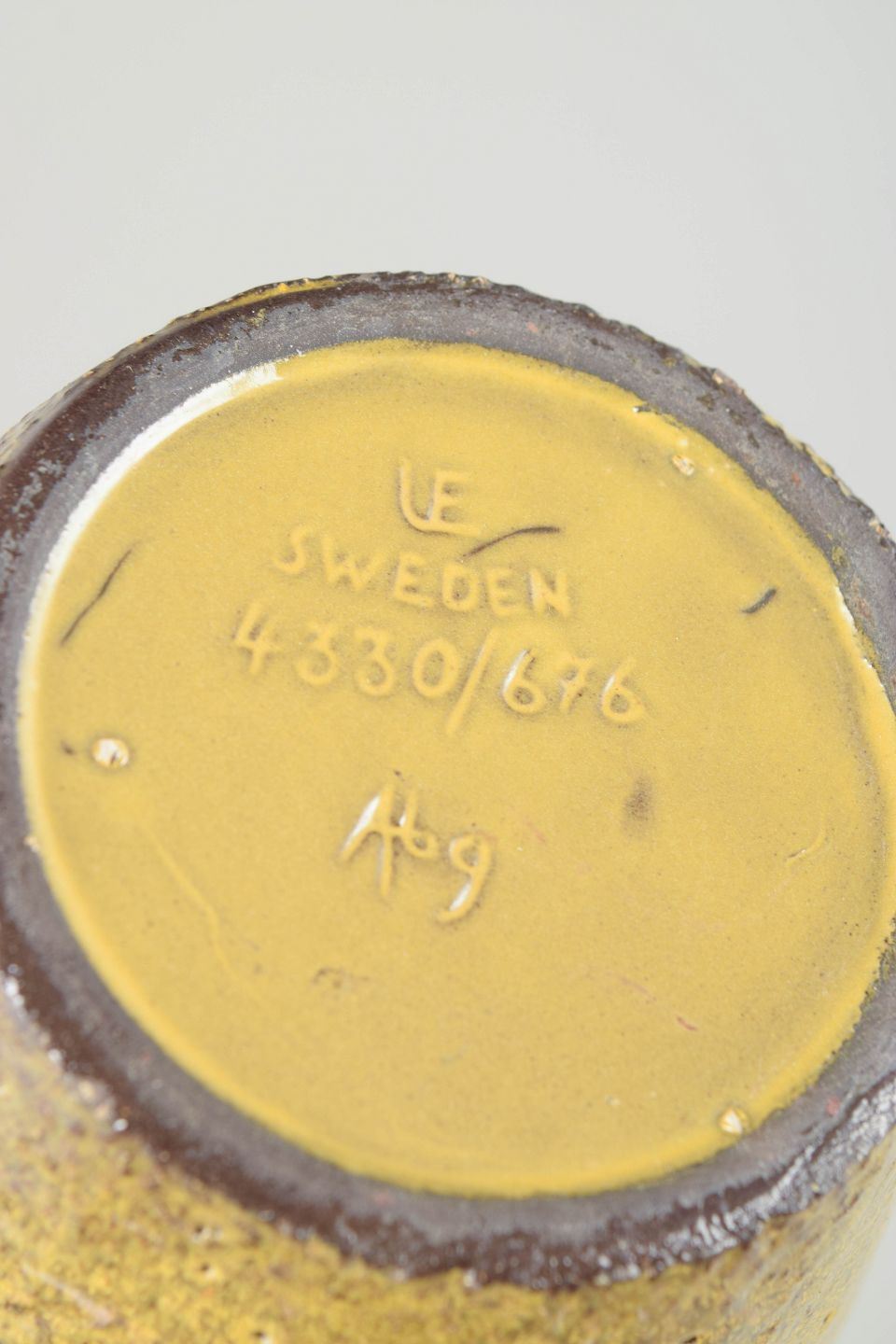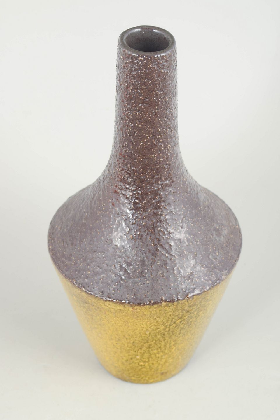 Elegant, høj vase i stentøj med slank form og karakteristisk tofarvet glasur i gul og brunviolette nuancer. Modellen 4330/676 fra 1960’erne fremstår med en raffineret overflade og klassisk skandinavisk formsprog.