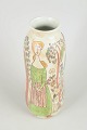 Slank stentøjsvase med håndmalet figurativ dekoration i grønne, røde og jordfarvede nuancer, udført i en karakteristisk kunstnerisk stil med tydelig reference til midten af det 20. århundredes skandinaviske keramik.