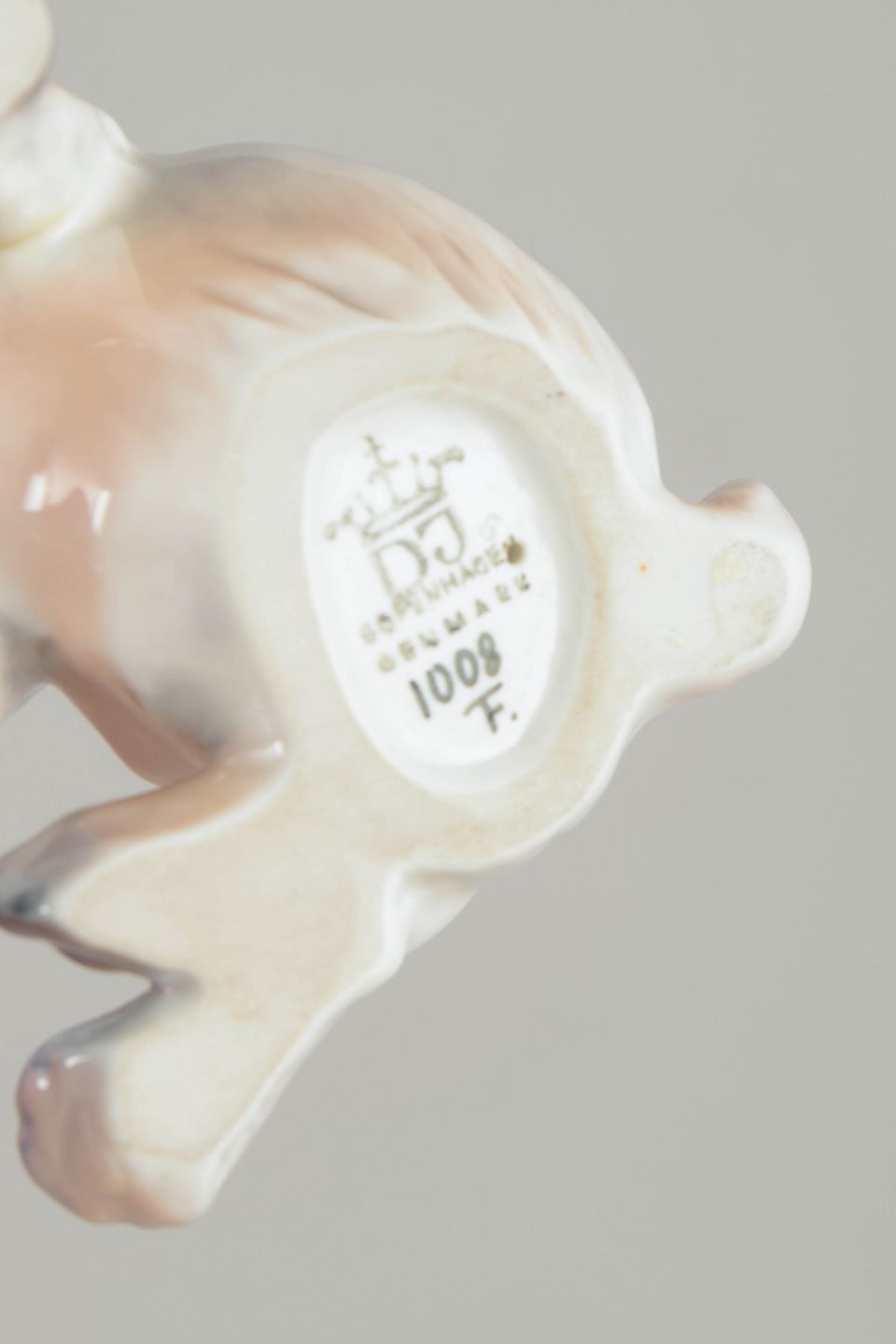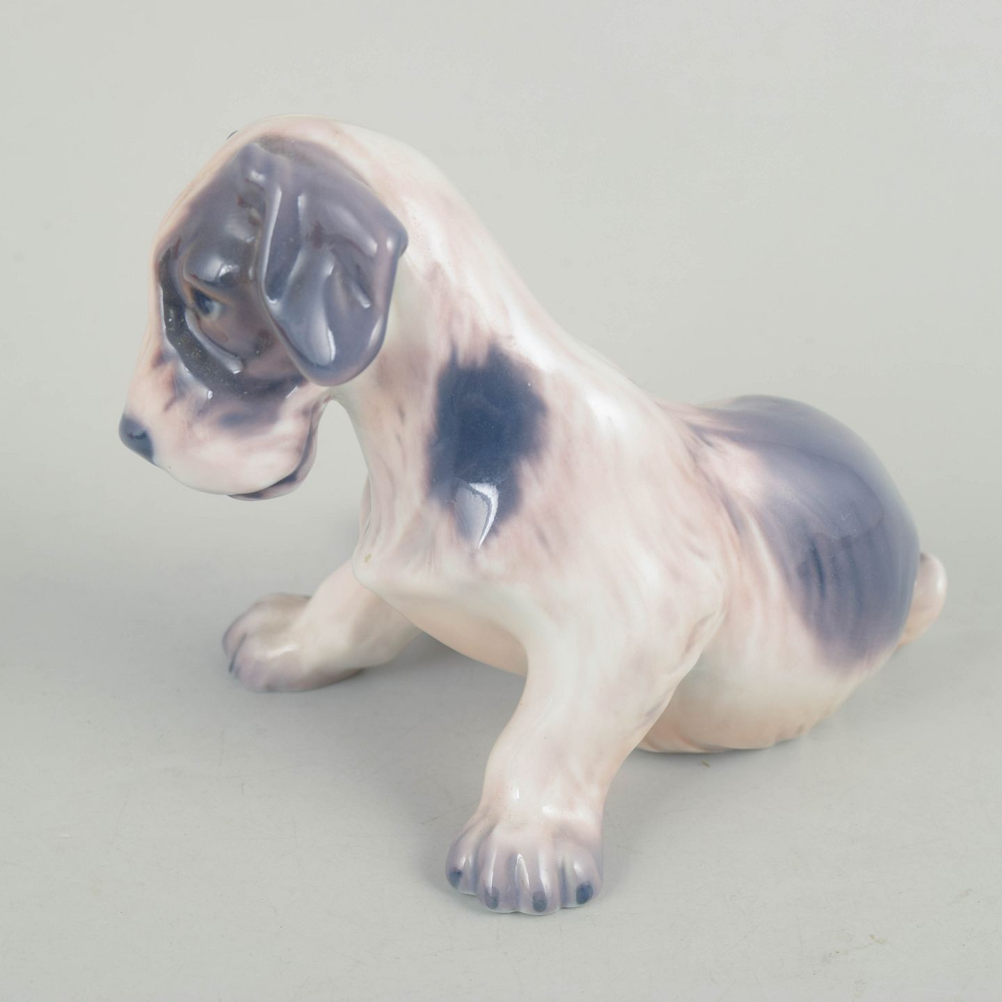 Naturalistisk udført porcelænsfigur af siddende hund med bløde former og fint modellerede detaljer. Glaseret i afdæmpede nuancer med brungrå markeringer. Model 1008.