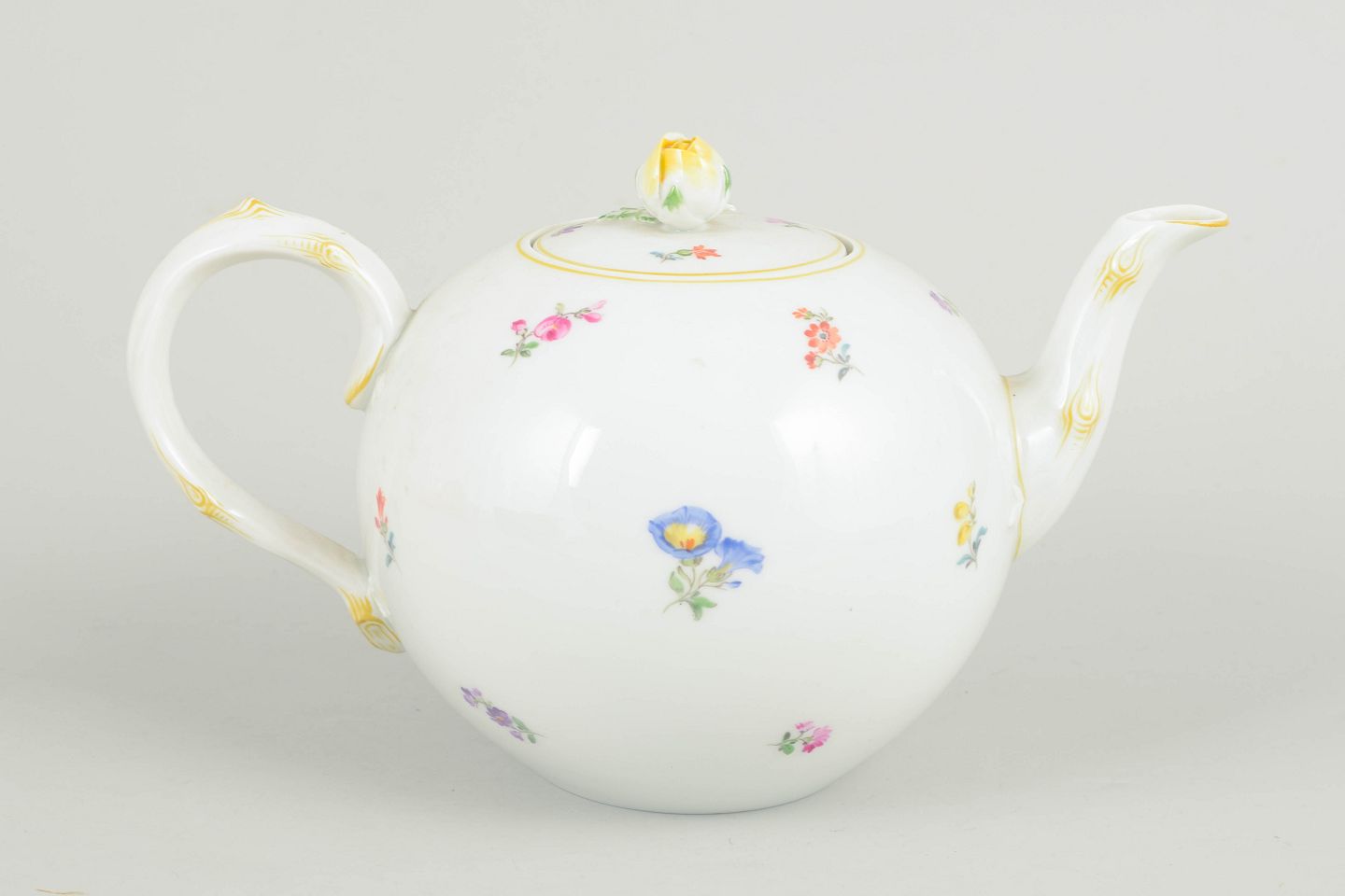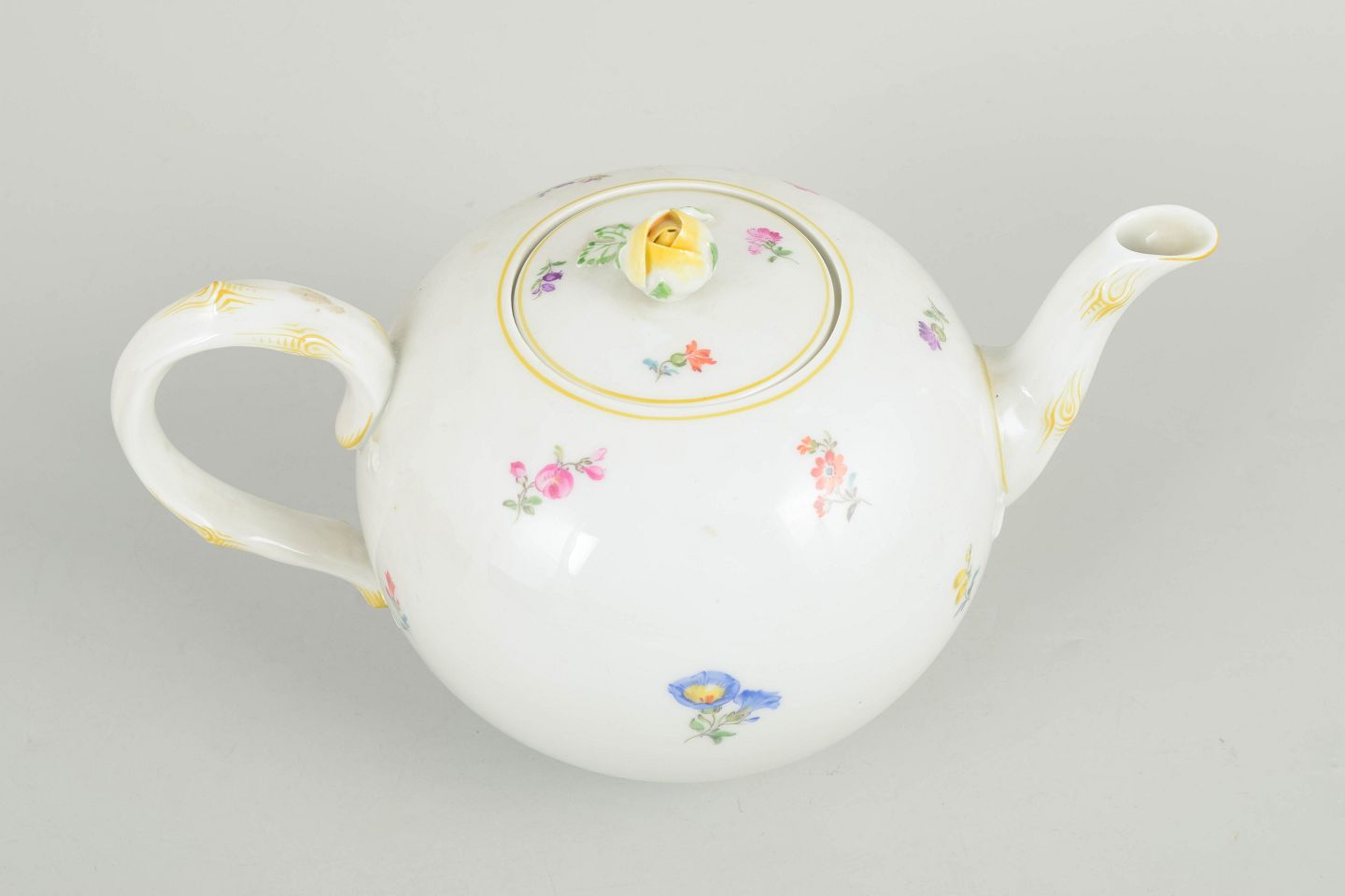 Tekande i porcelæn håndmalet med polykrome blomster og dekoreret med guldkant. Rund korpus med svungen tud og elegant hank samt låg med knop, udført i klassisk Meissen stil fra midten af det 20. århundrede. Undersiden mærket med Meissen krydssværd, første sortering.
