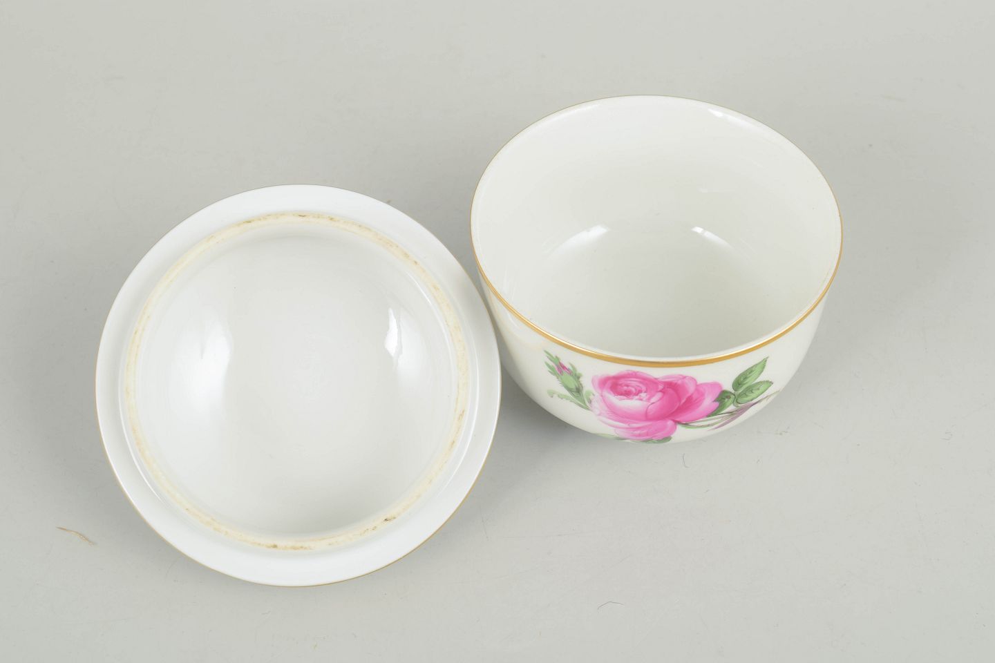 Sukkerskål i porcelæn med låg, håndmalet med polykrome blomster og guldkant. Dekoreret med større rosenmotiver og knopformet låggreb i klassisk Meissen stil fra midten af det 20. århundrede. Undersiden mærket med Meissen krydssværd.