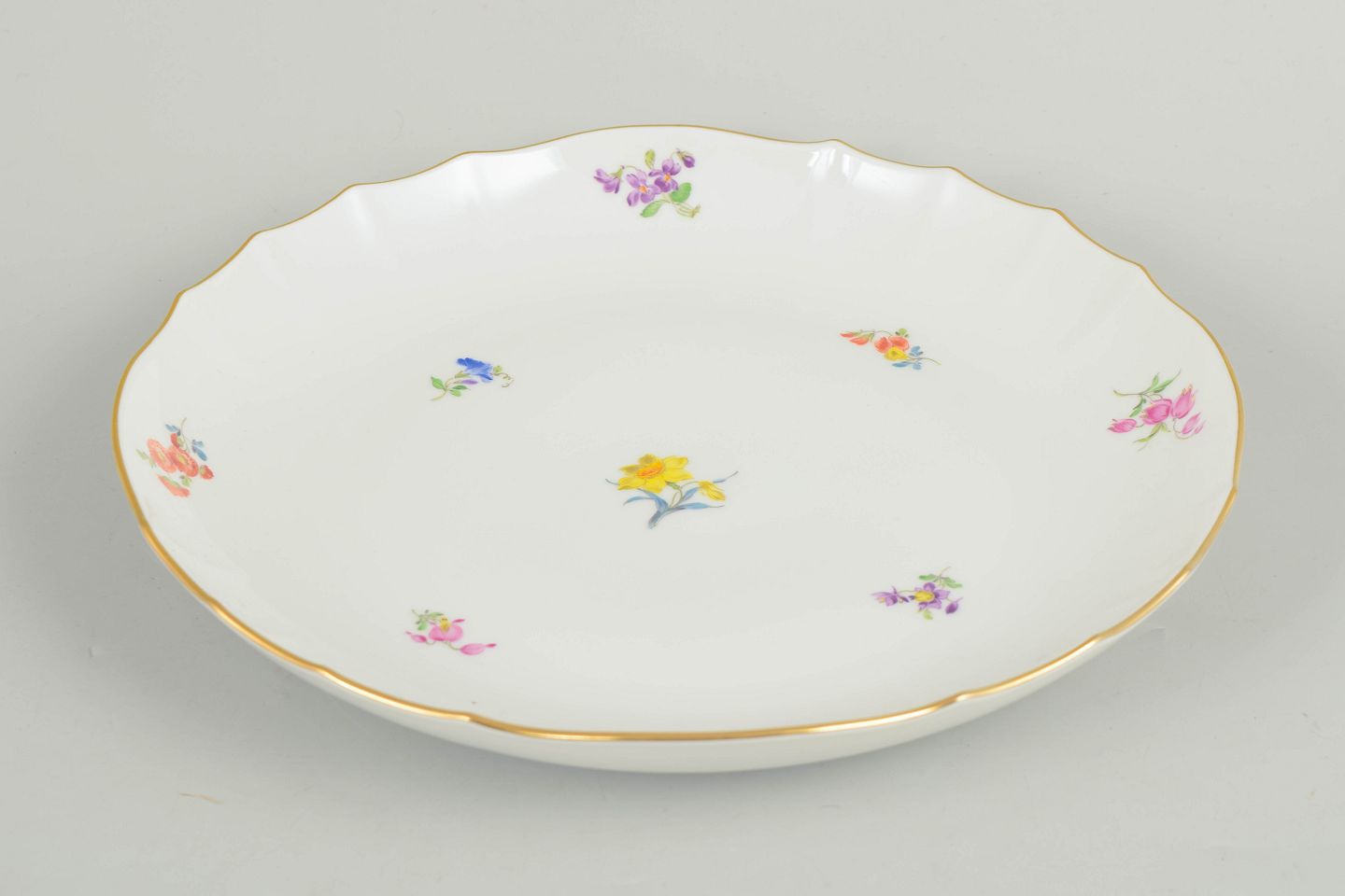 Stort rundt porcelænsfad håndmalet med spredte polykrome blomster og guldkant. Klassisk Meissen dekoration fra midten af det 20. århundrede, udført i fin kvalitet med let bølget rand. Undersiden mærket med Meissen krydssværd.