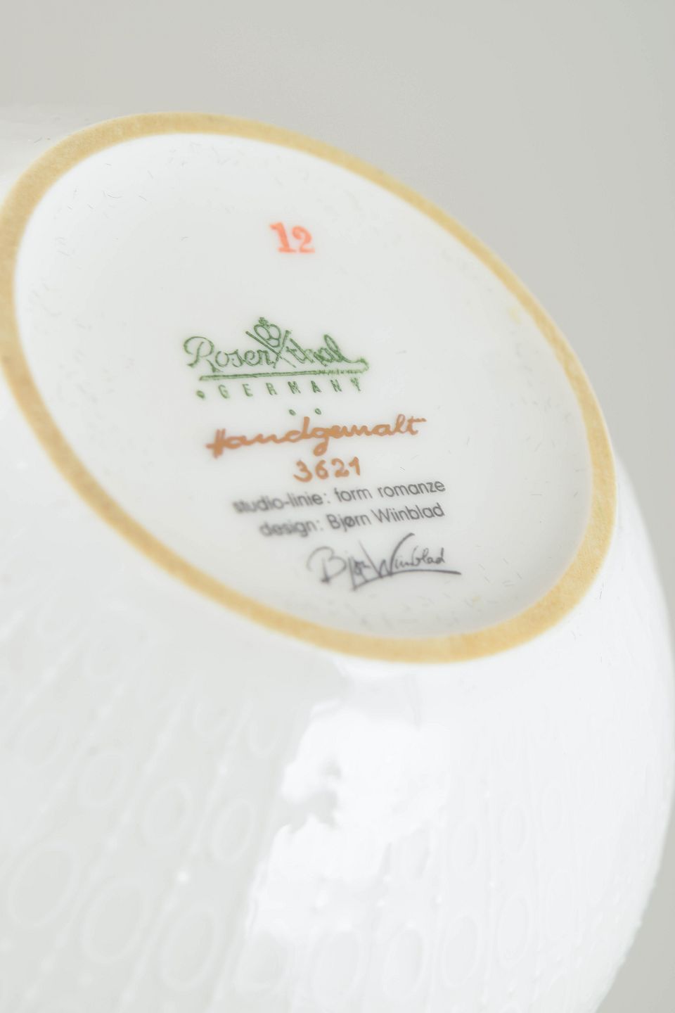 Bjørn Wiinblad (1918–2006) var en dansk kunstner og designer kendt for sit fantasifulde og dekorative formsprog. Han arbejdede med keramik, grafik, scenografi og design og samarbejdede blandt andet med Rosenthal, hvor han skabte nogle af sine mest ikoniske porcelænsserier. Hans værker er præget af eventyrlige motiver, organiske linjer og en tydelig personlig stil.