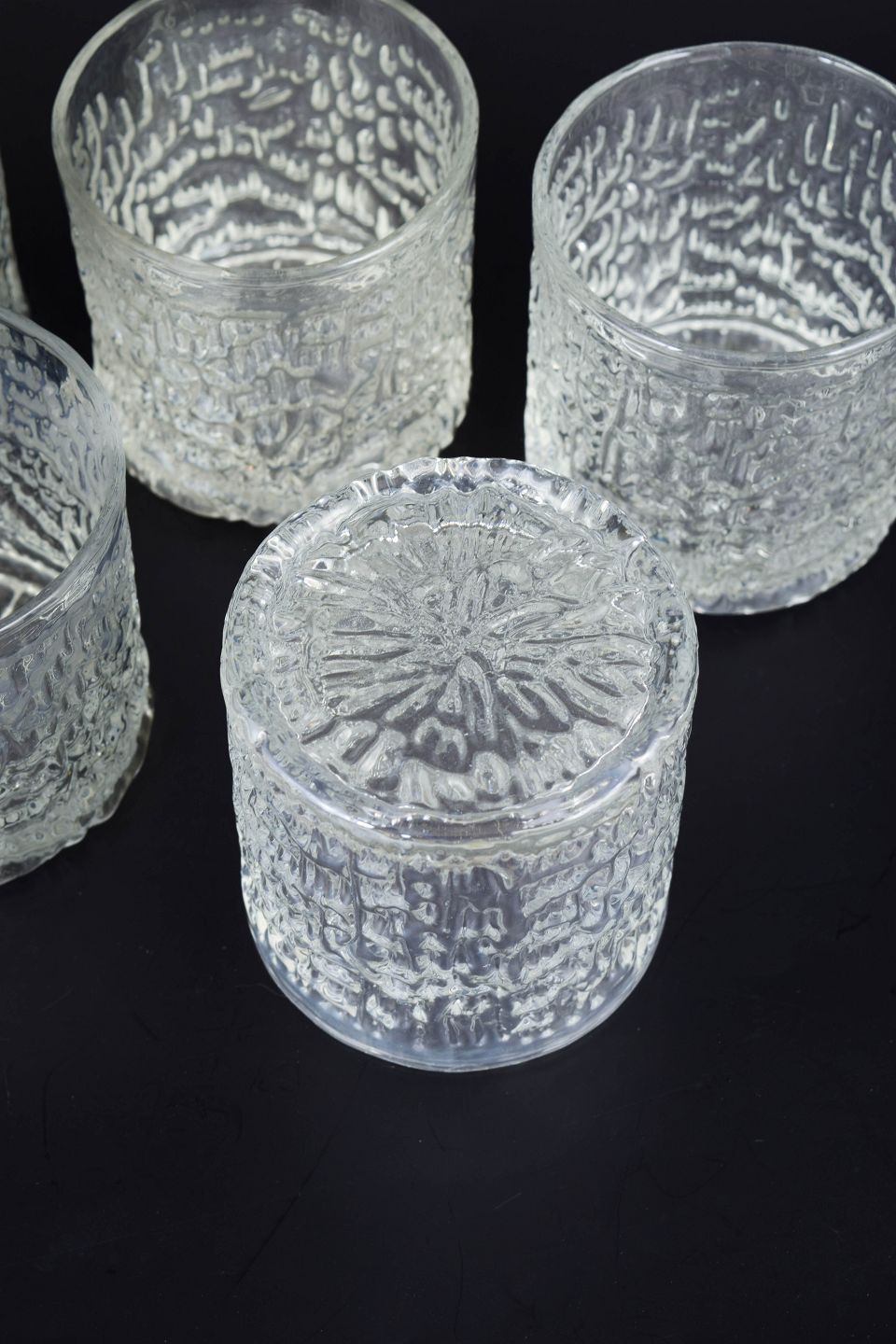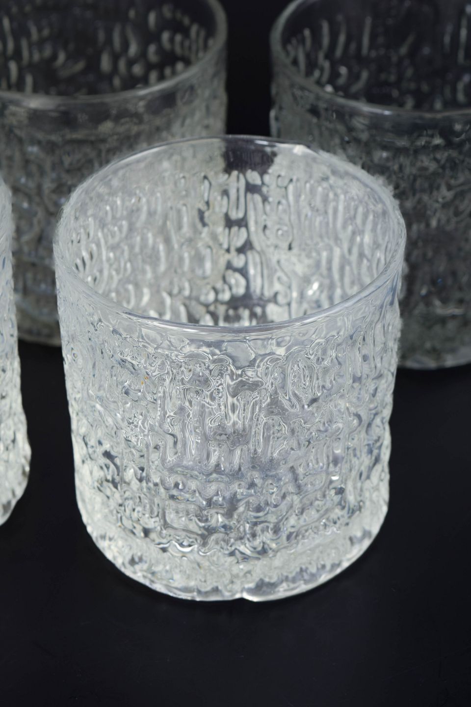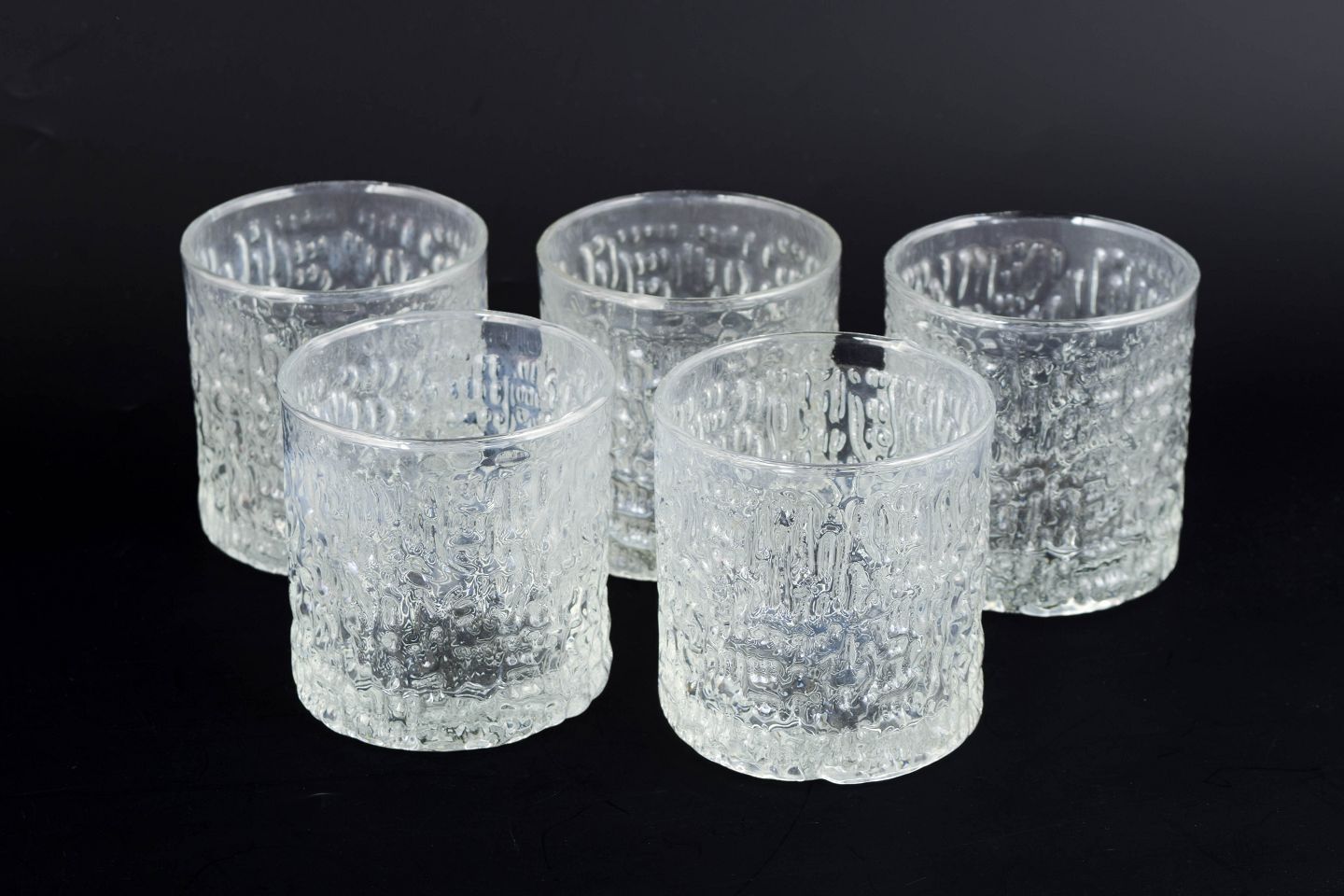 Klassiske whiskyglas i klart presset glas med dekorativ struktur og kraftig bund, model “Siesta”. Produceret i England i 1980’erne.