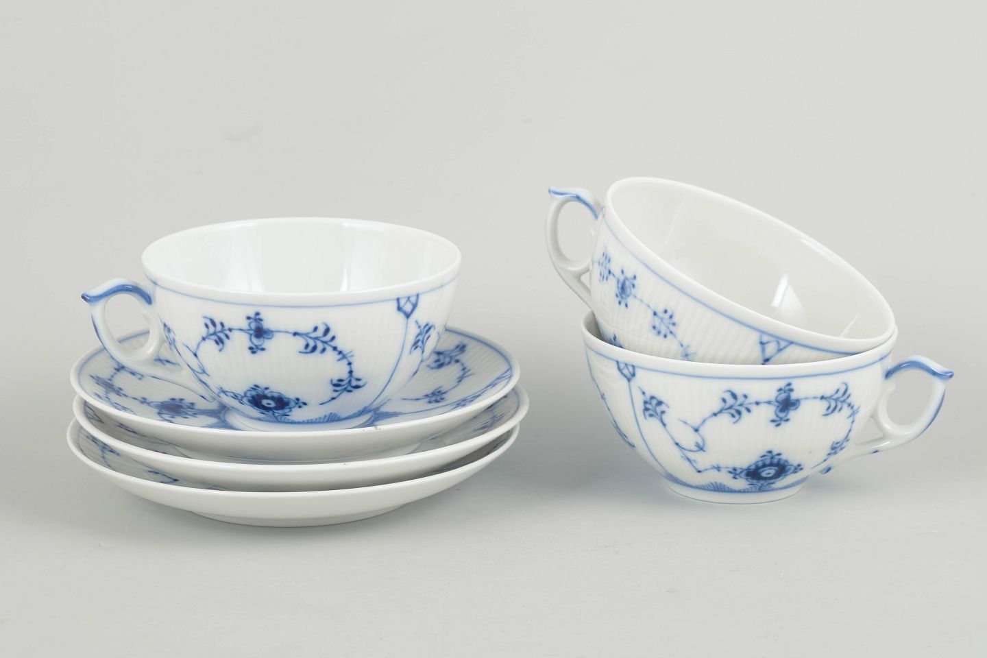 Tre tekopper med tilhørende underkopper i porcelæn med håndmalet dekoration i underglasurblå i det klassiske Musselmalet Riflet mønster. Model 1/315. Første sortering.