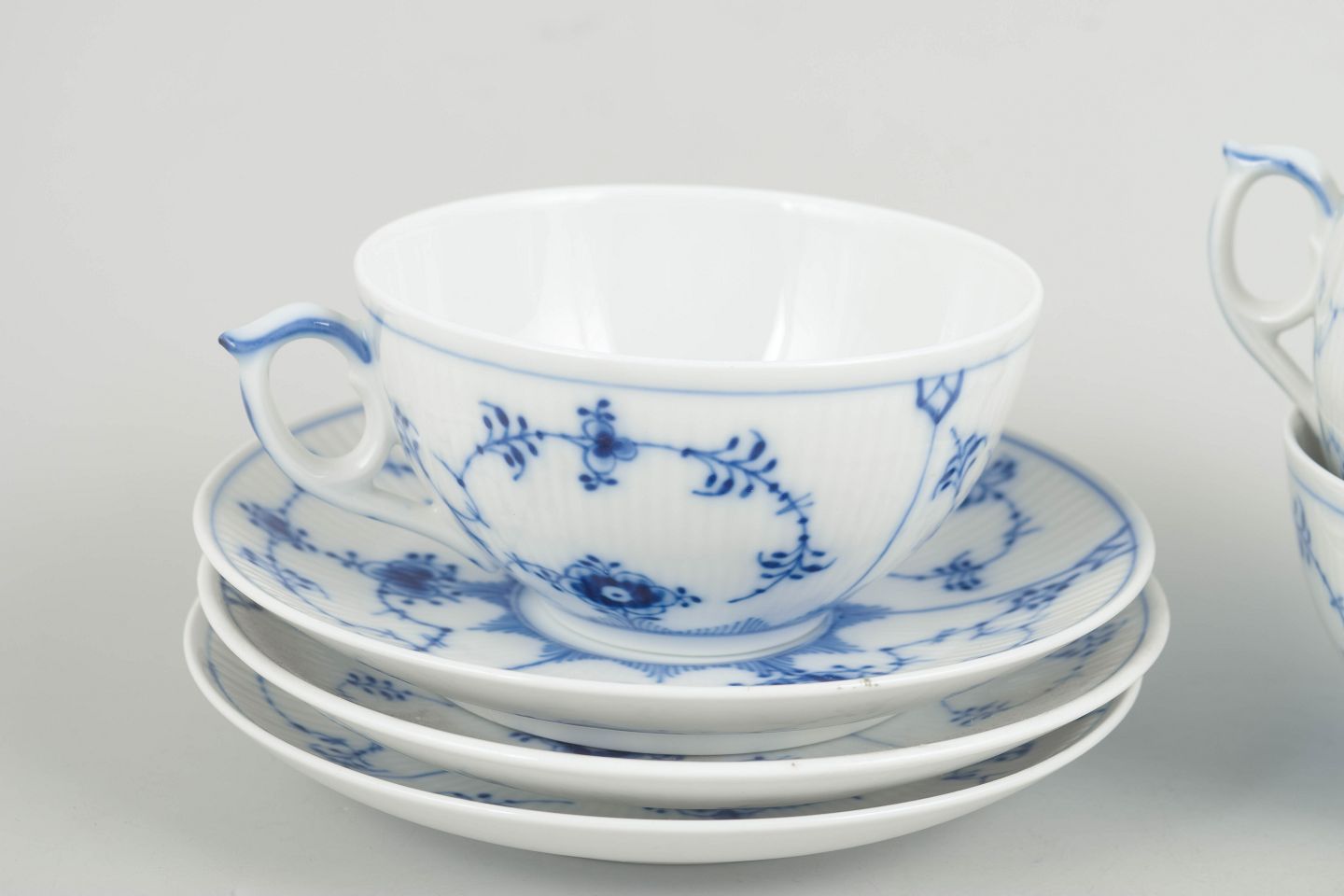 Royal Copenhagen Musselmalet Riflet, sæt af tre tekopper med underkopper.