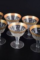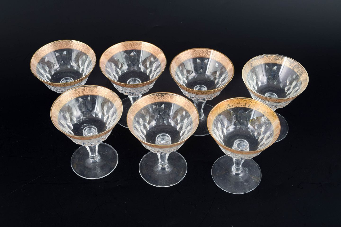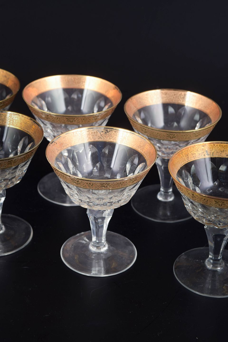 Elegant liquor glasses in cut crystal with 24 carat gold decoration along the rim, executed in a classic mid 20th century style.