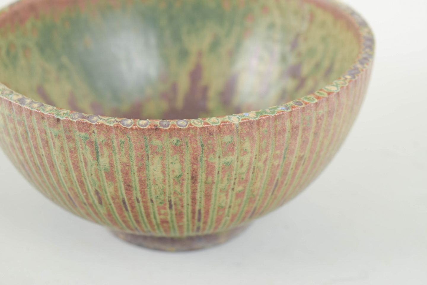 Rund skål i stentøj med riflet korpus og levende glasur i grønne og rosa nuancer. Model 111.