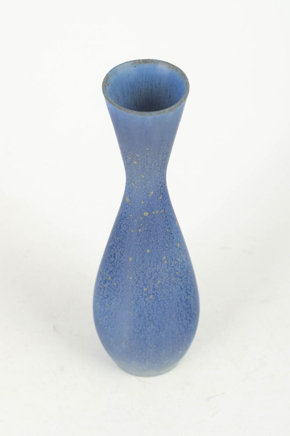 Slank, balusterformet vase i stentøj med smuk blå glasur med fine spil og let indsnævret hals. Et klassisk eksempel på Stålhane’s arbejde med enkle former og raffinerede glasurer.