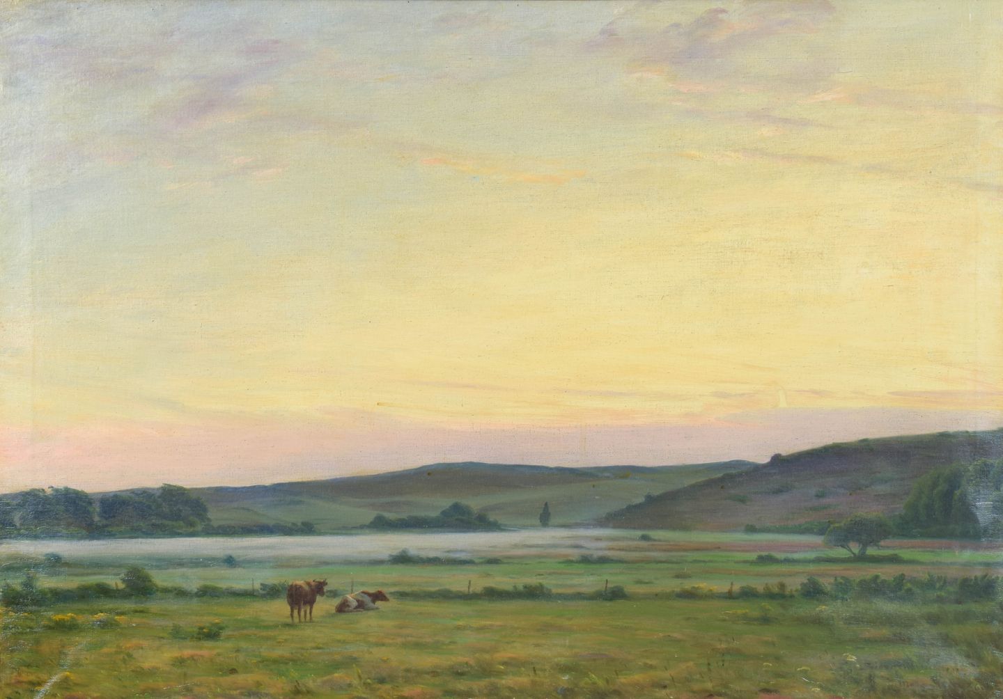 Naturalistisk landskab med græssende køer i åbent terræn under blød himmel, udført med fin farveafstemning og rolig stemning.