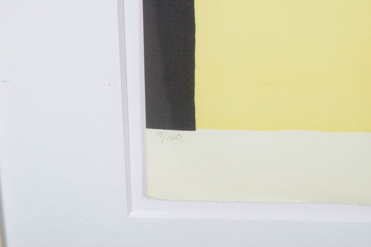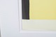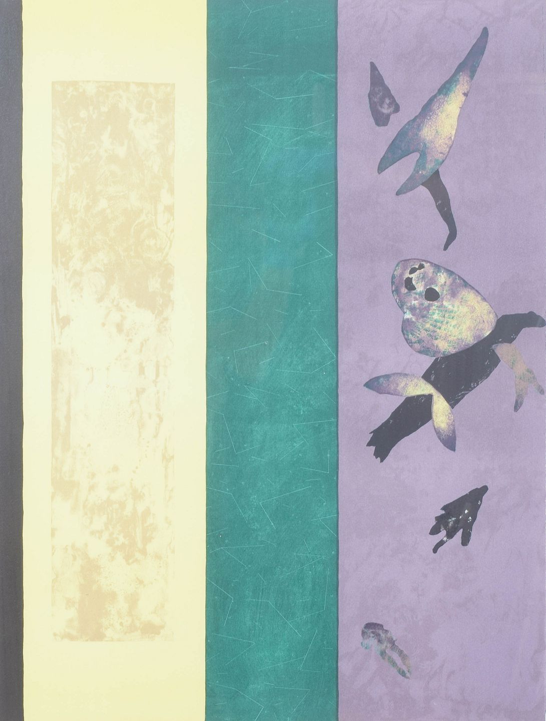 Abstrakt komposition med vertikale farvefelter og svævende organiske former, udført som farvelitografi, signeret og nummereret 19/150, dateret 1995.