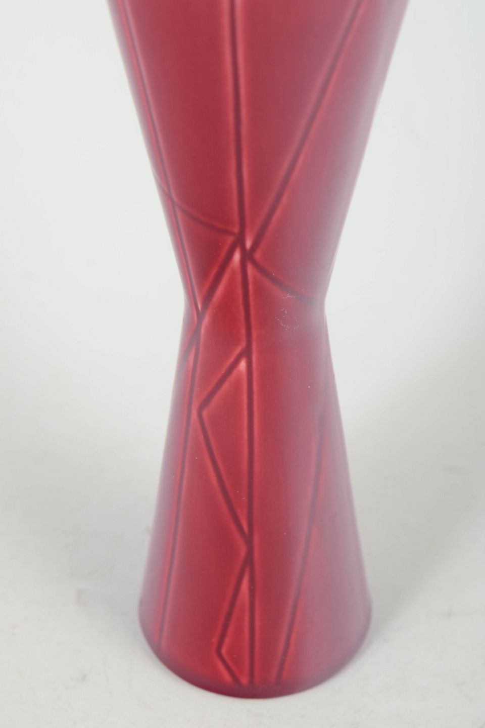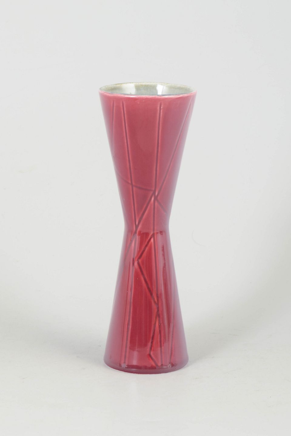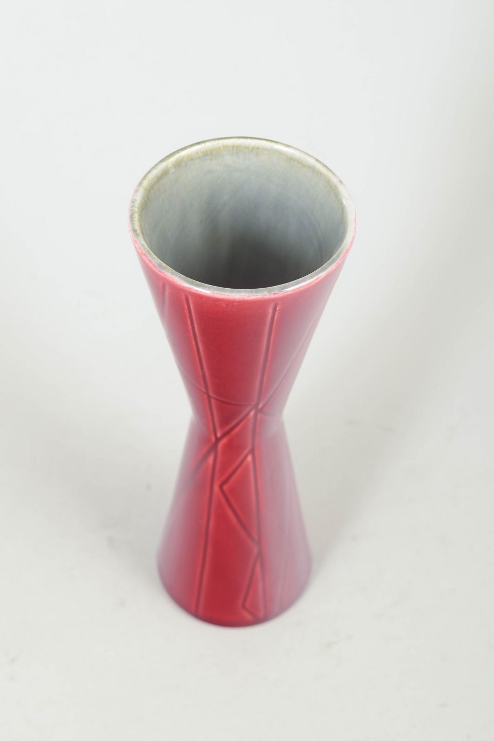 Slank timeglasformet vase i glaseret stentøj med dyb rød glasur og indridset dekor. Modellen "California" er et karakteristisk eksempel på Stålhane’s elegante og stramt formgivne keramik fra perioden.