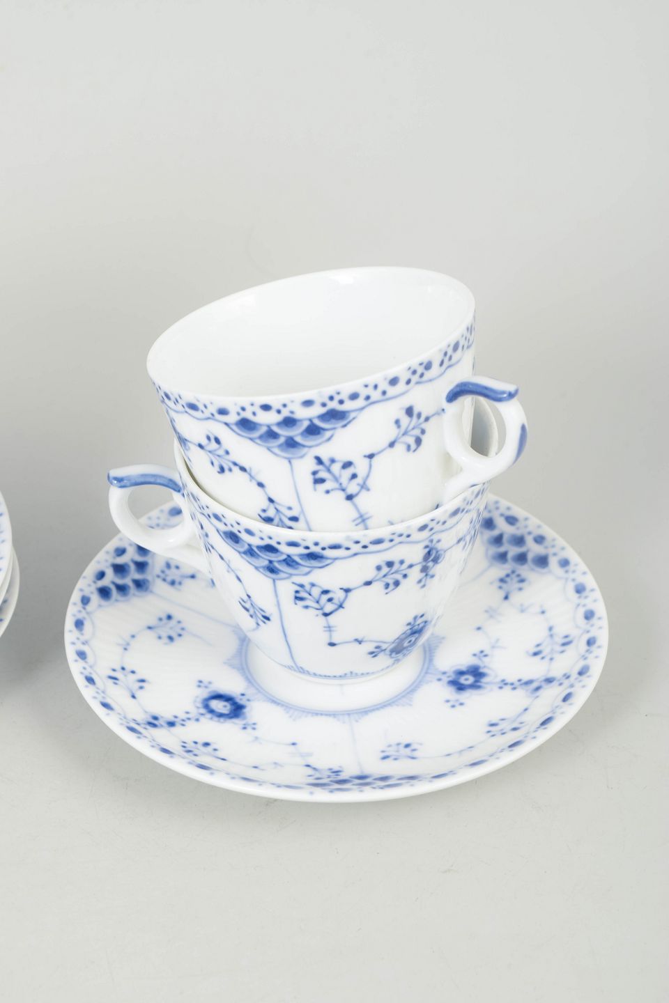 Royal Copenhagen Musselmalet Halvblonde, sæt af fire kaffekopper med underkopper.