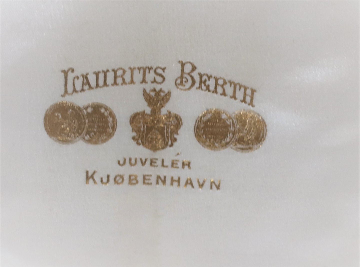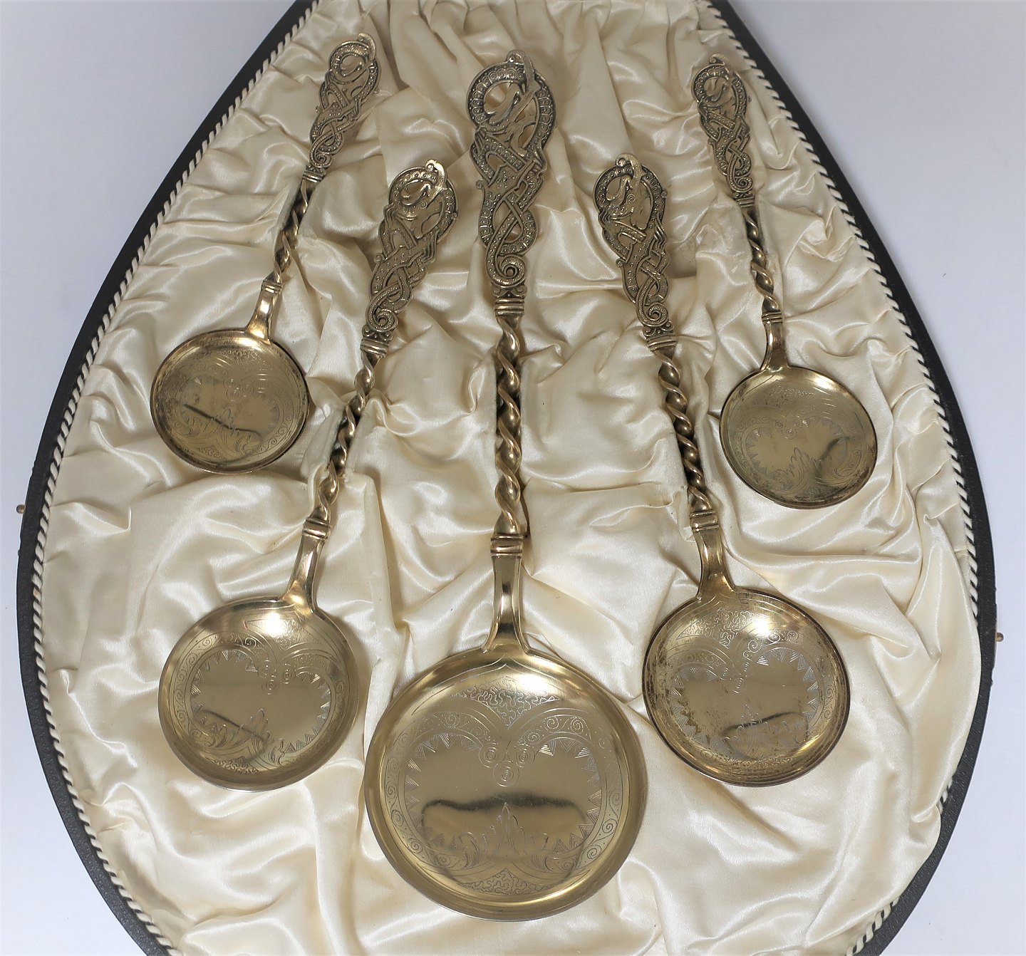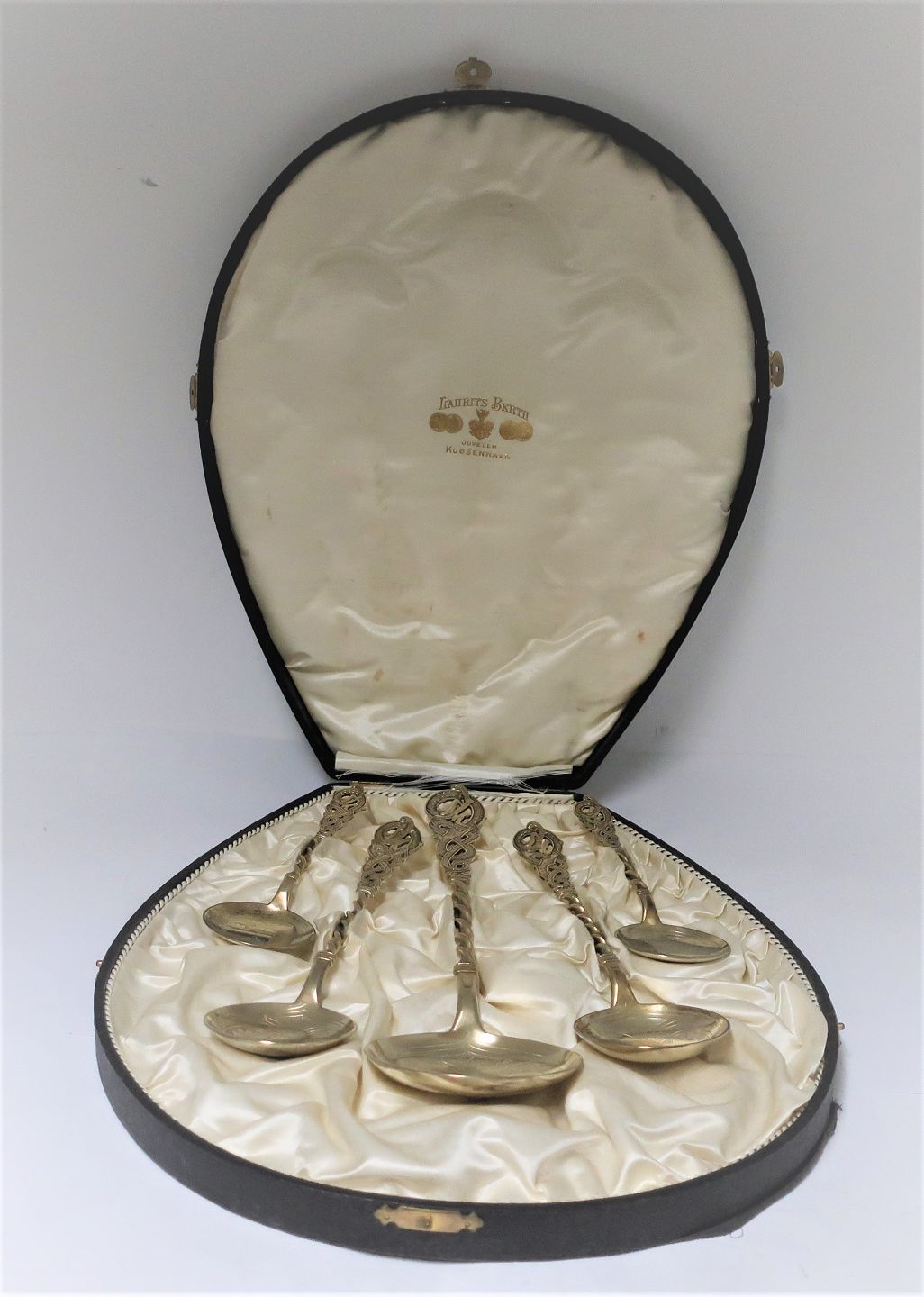 Laurits Berth. 5 sølv serveringsdele forgyldte (830). Længde mellem 14,5 - 25 cm. Produceret 1912. I original æske.