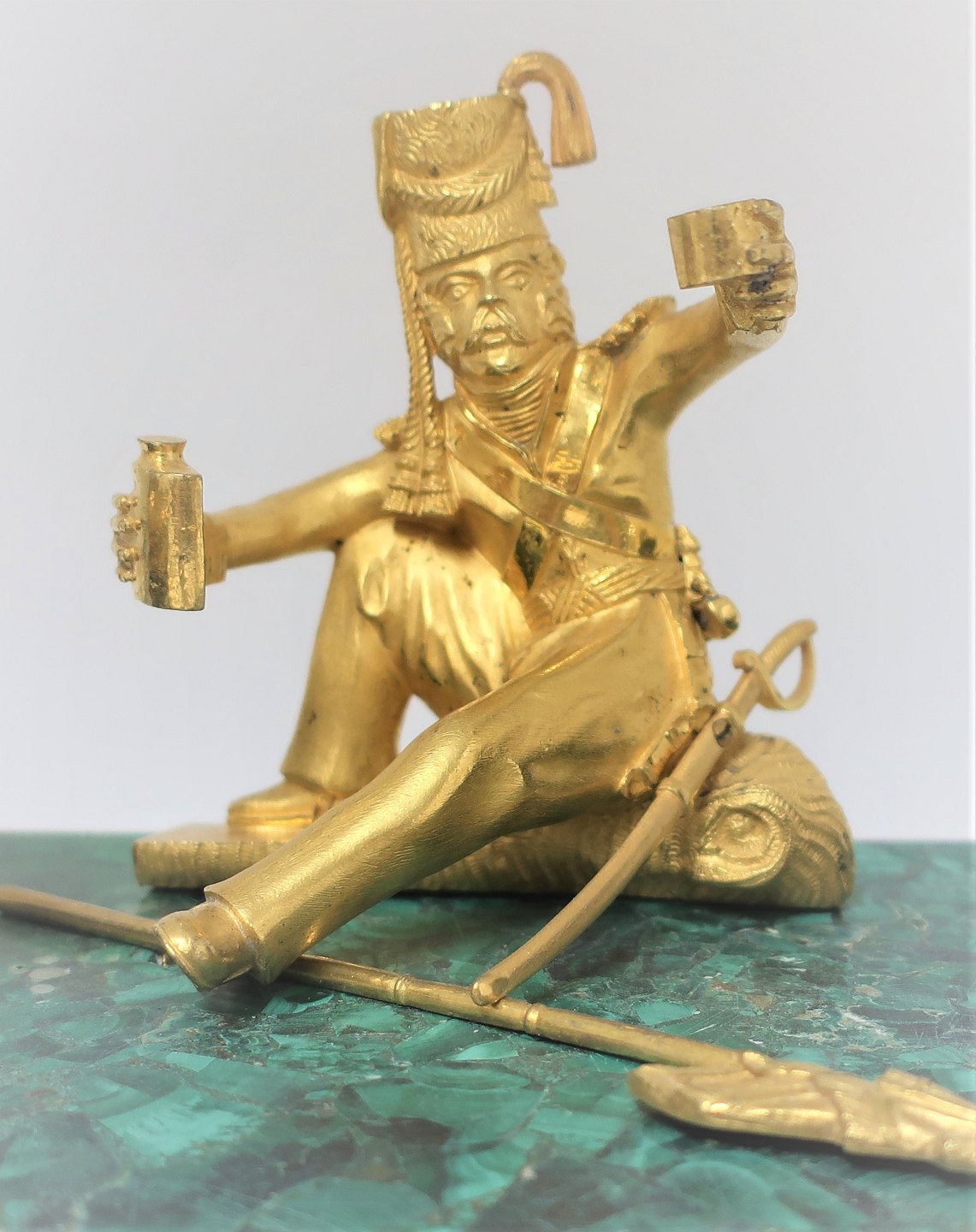 Ink house with base of malachite, and gilded soldier. Length 28 cm. Width 14 cm. Height 14 cm. Probably Russian.