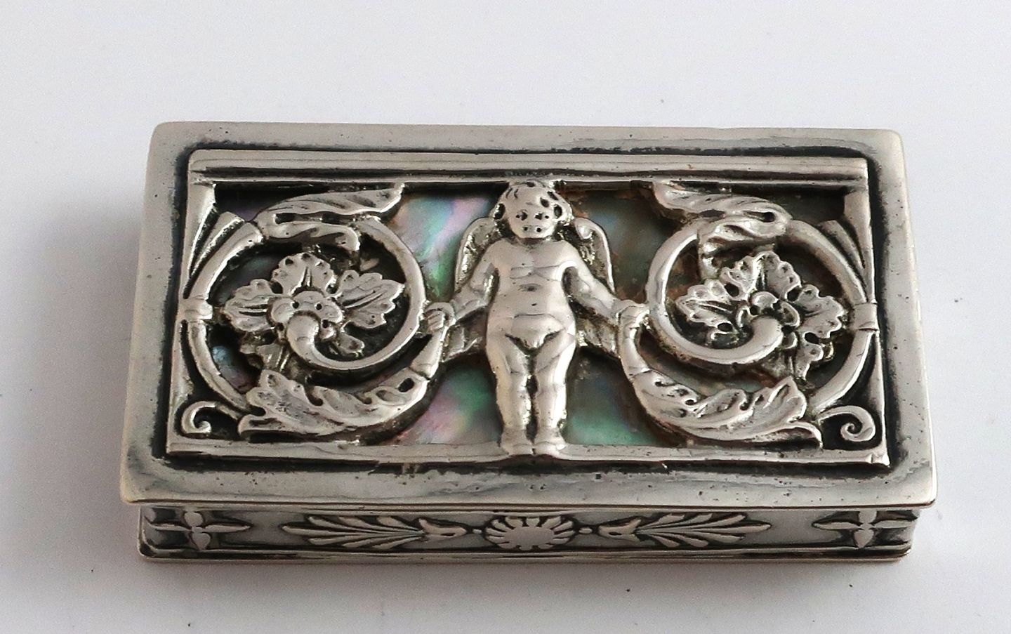 Small silver box (830). With mother of pearl at the bottom of the lid. Length 5.3 cm. Width 3 cm.