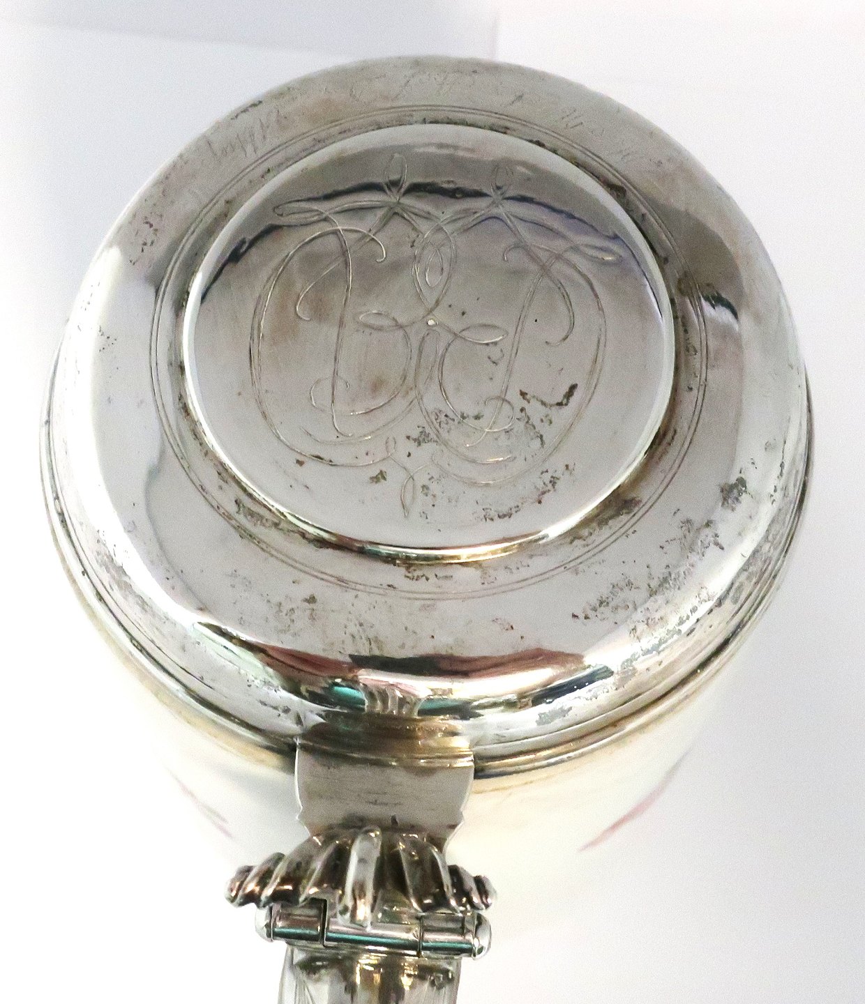Royal Copenhagen. Lidded mug decorated with flowers with silver lid. Lid not stamped. Height 17 cm. Diameter 12 cm