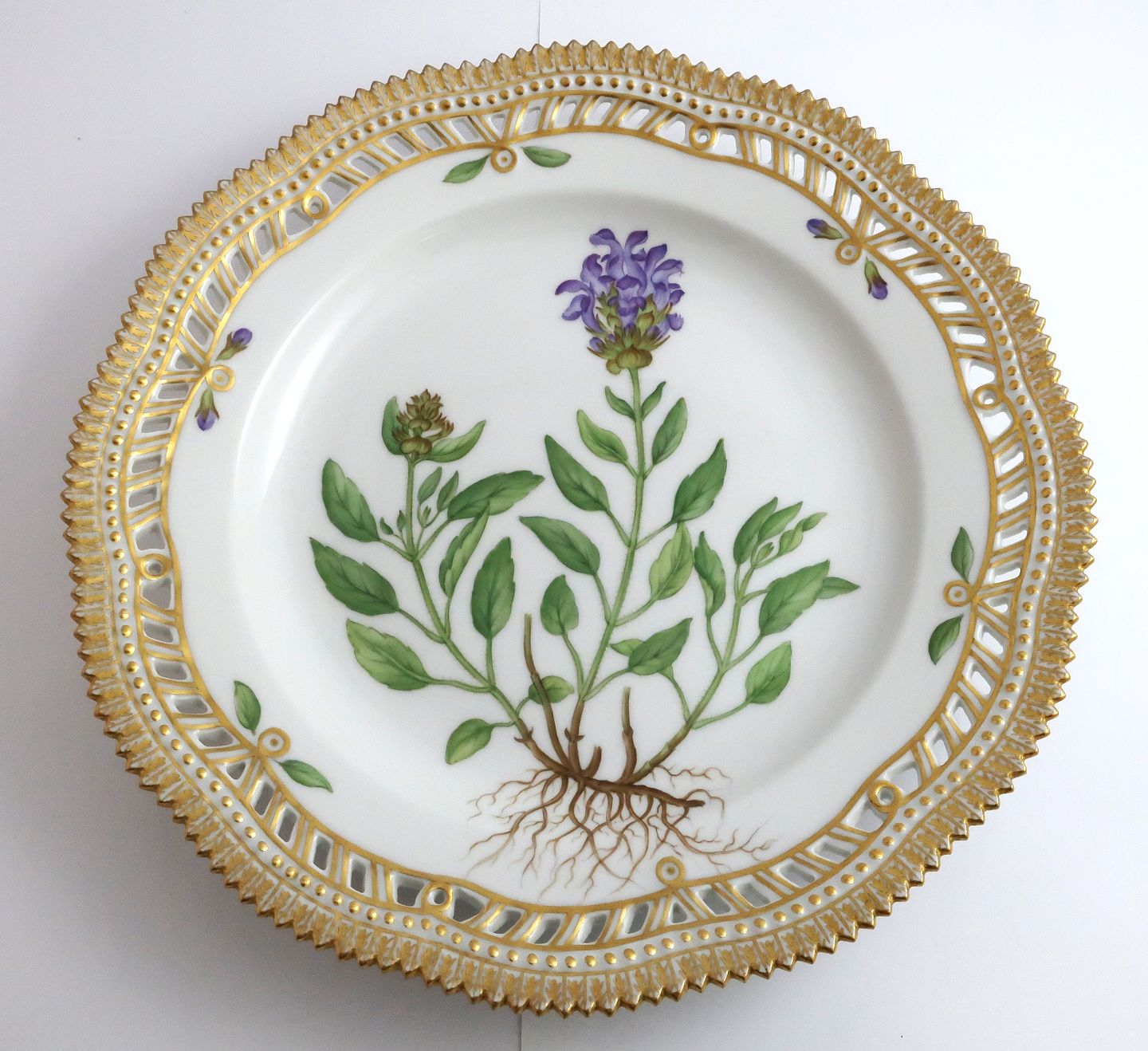Royal Copenhagen. Flora Danica tallerken med gennemskåret bort. Diameter 25 cm. Model 3553. ( 1 sortering ). Brunella grandiflora