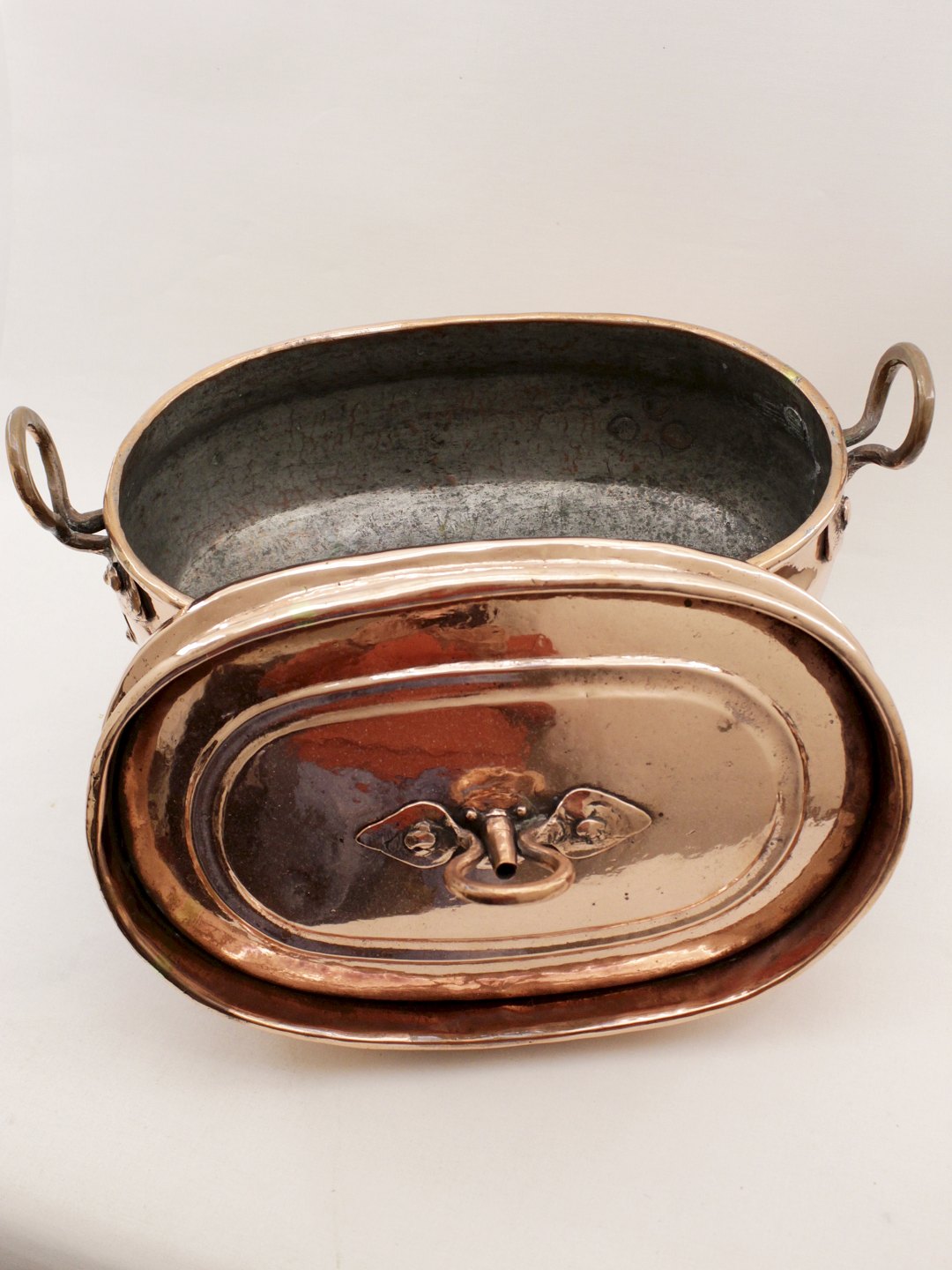 Stor kobber postej form på 3 ben H. 30 cm. og 44 x 24 cm.
