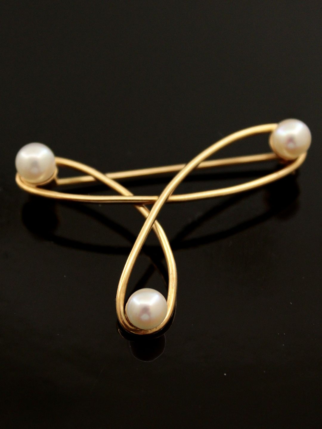 14 carat gold brooch 4.2 x 3 cm. with 3 genuine pearls from jeweler Svend Haugaard Kolding item no. 501950