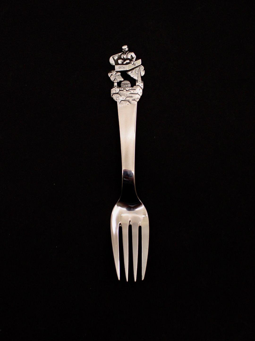 H C Andersen barne gaffel 14,5 cm. "Den Flyvende Kuffert" flot ingengraveringer og tretårnet sølv emne nr. 566911