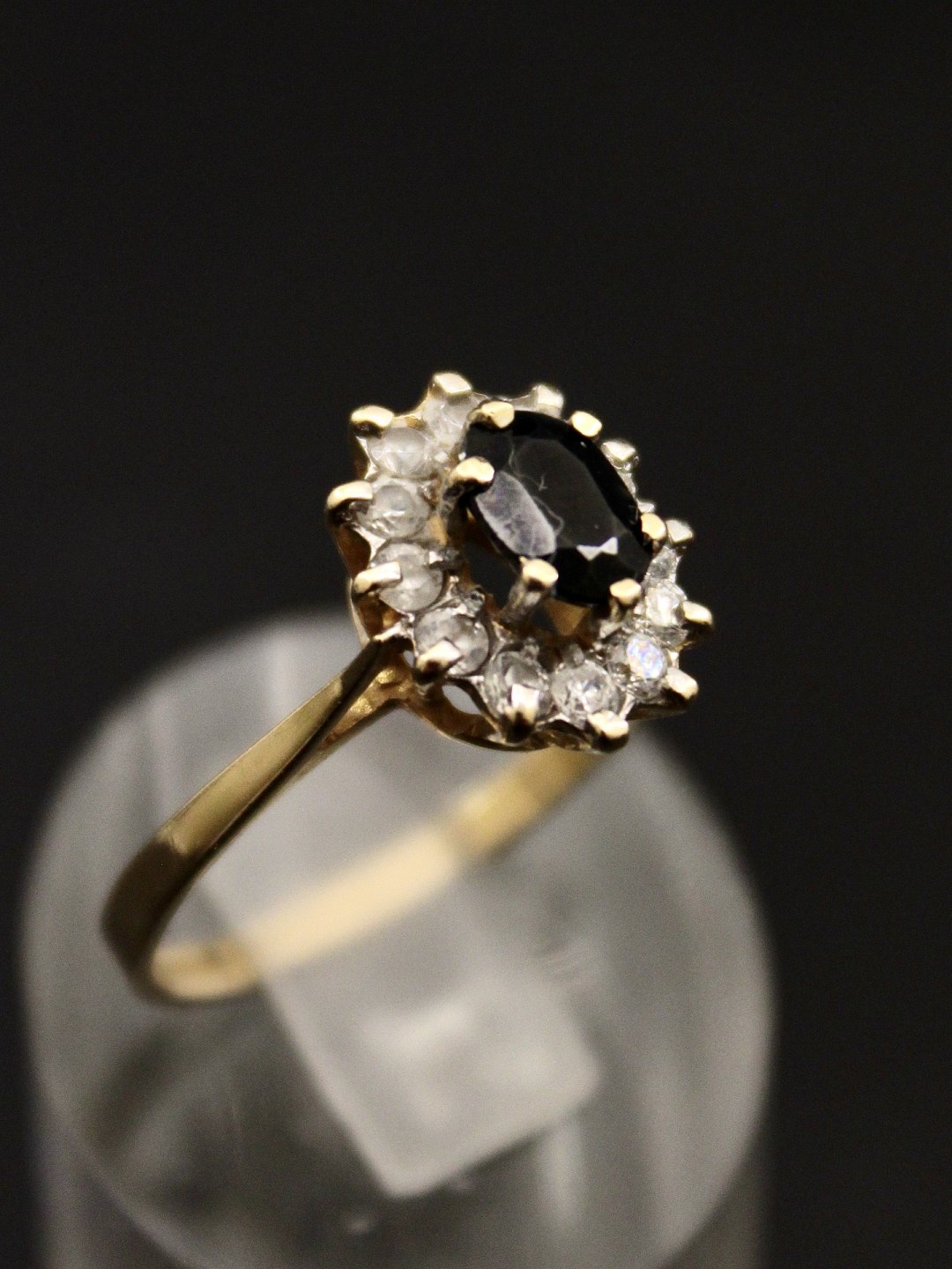 14 karat guldring størrelse 58 med ametyst omgivet af klare stene emne nr. 587140