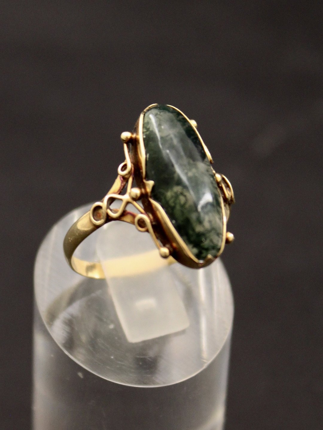 14 karat guldring størrelse 61 med mosagat stemplet 585 BH for hofjuveler B Hertz emne nr. 615528