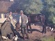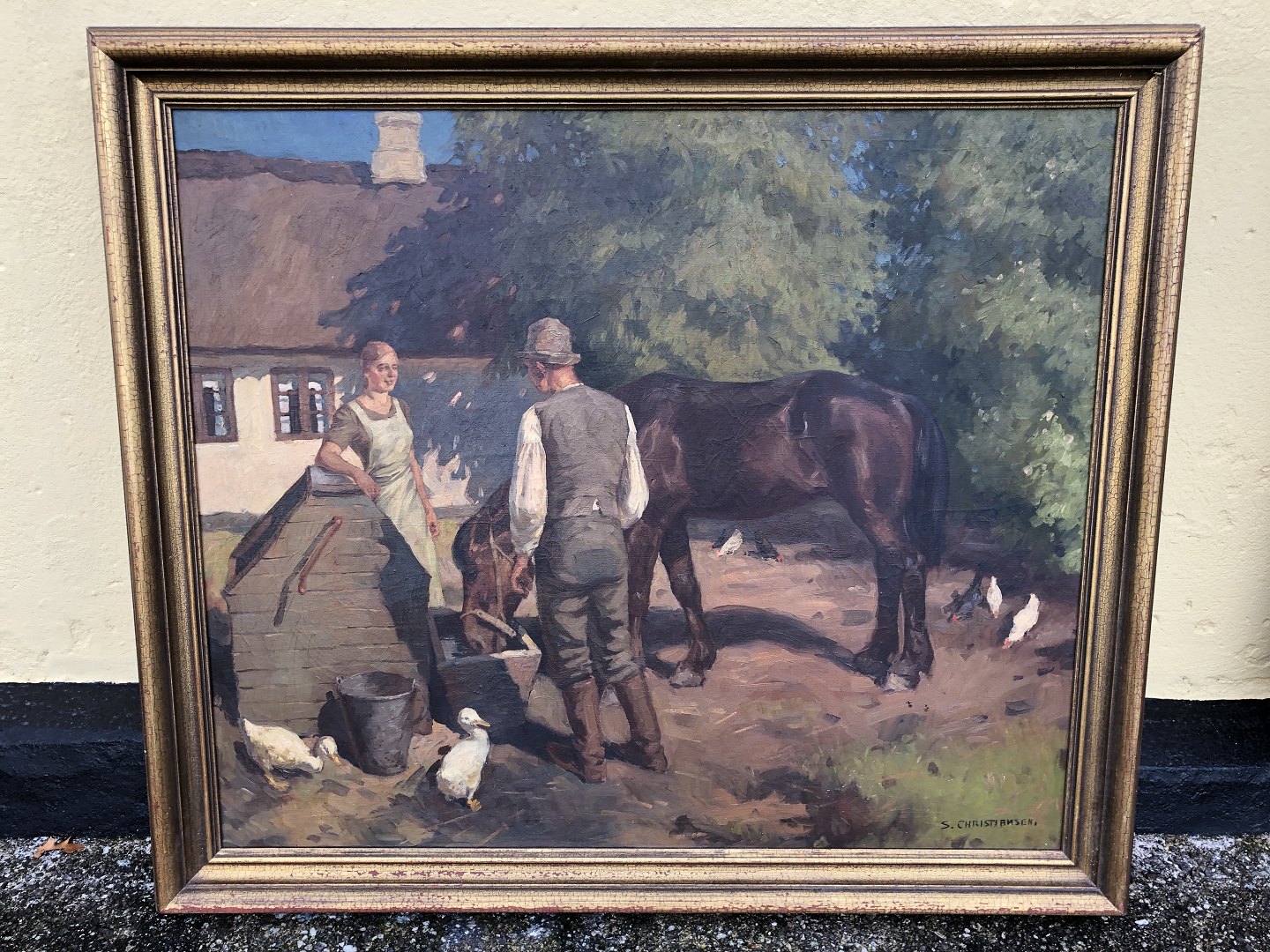 S. Christiansen, Countryside couple with horse, ducks and chickens, oil painting on canvas. Dimensions with frame: 118x103
