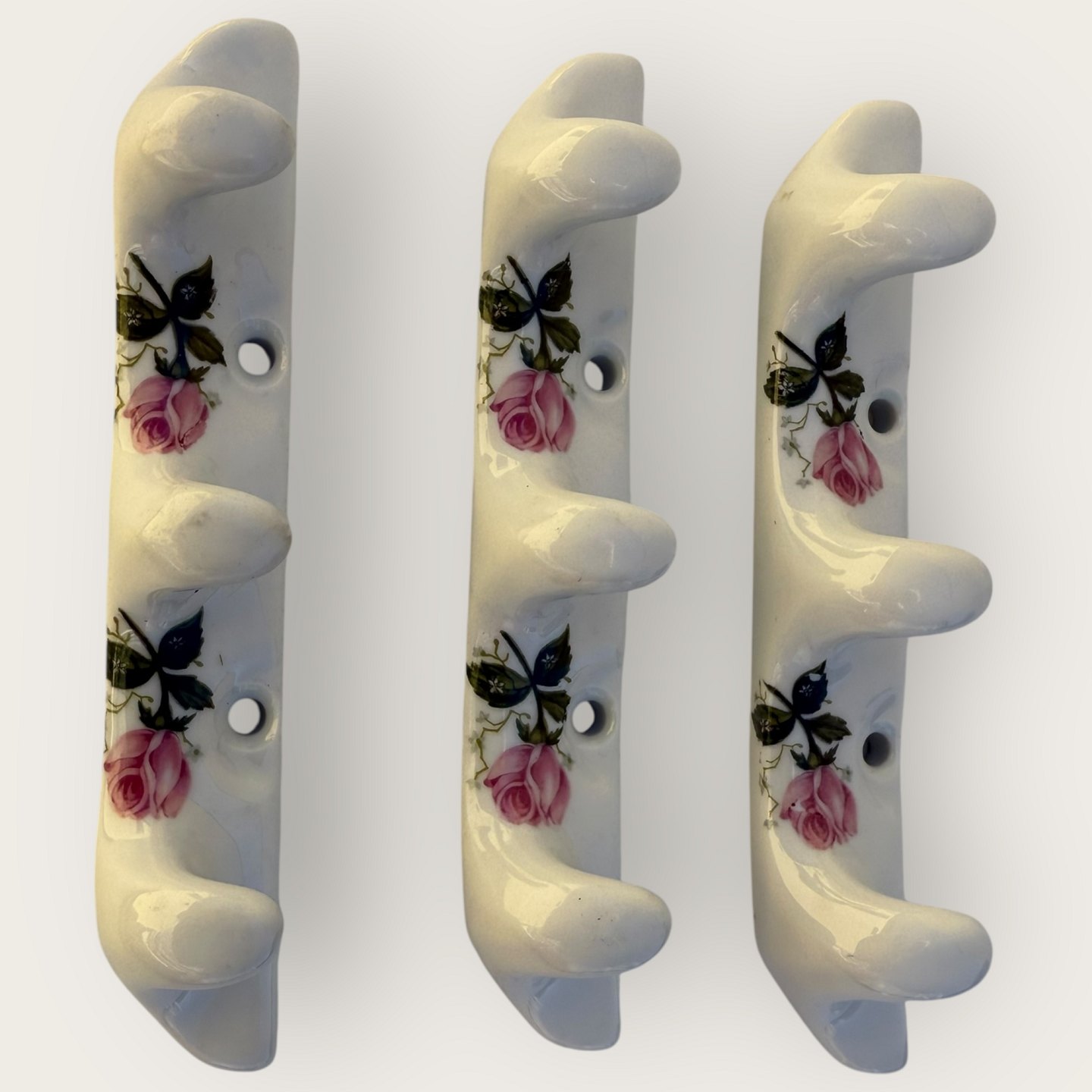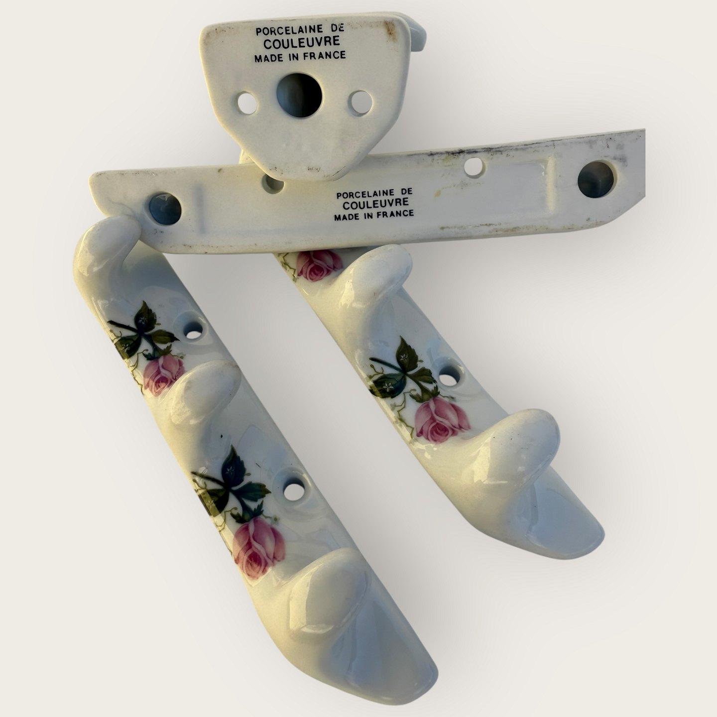 Porcelaine de Couleuvre, Made in France, Coat hooks with roses, The three are 16cm long, fine condition