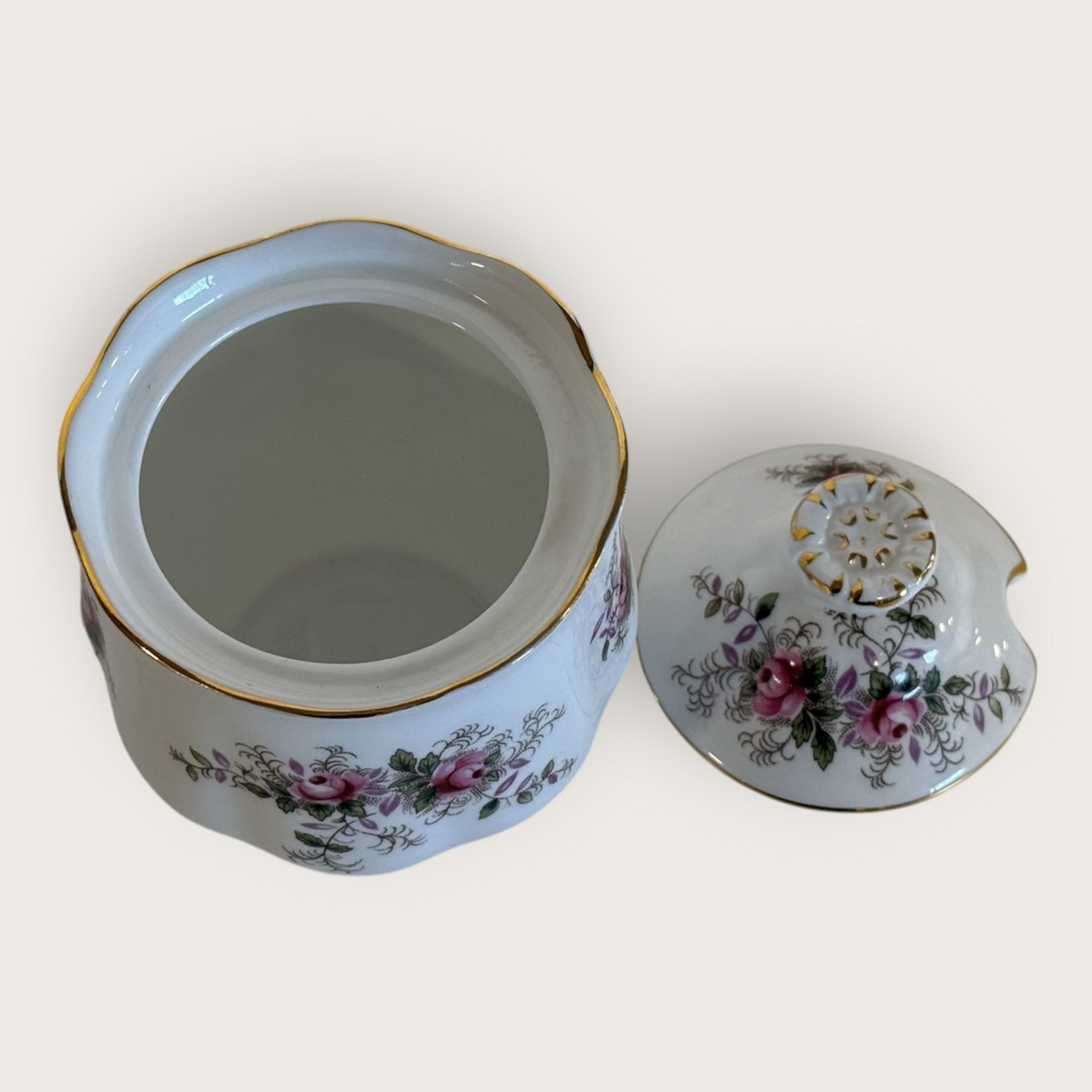 Royal Albert, Bone China, Lavender Rose, Jam jar with lid, height 10cm *Perfect condition*