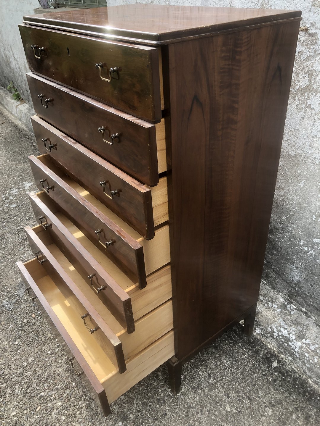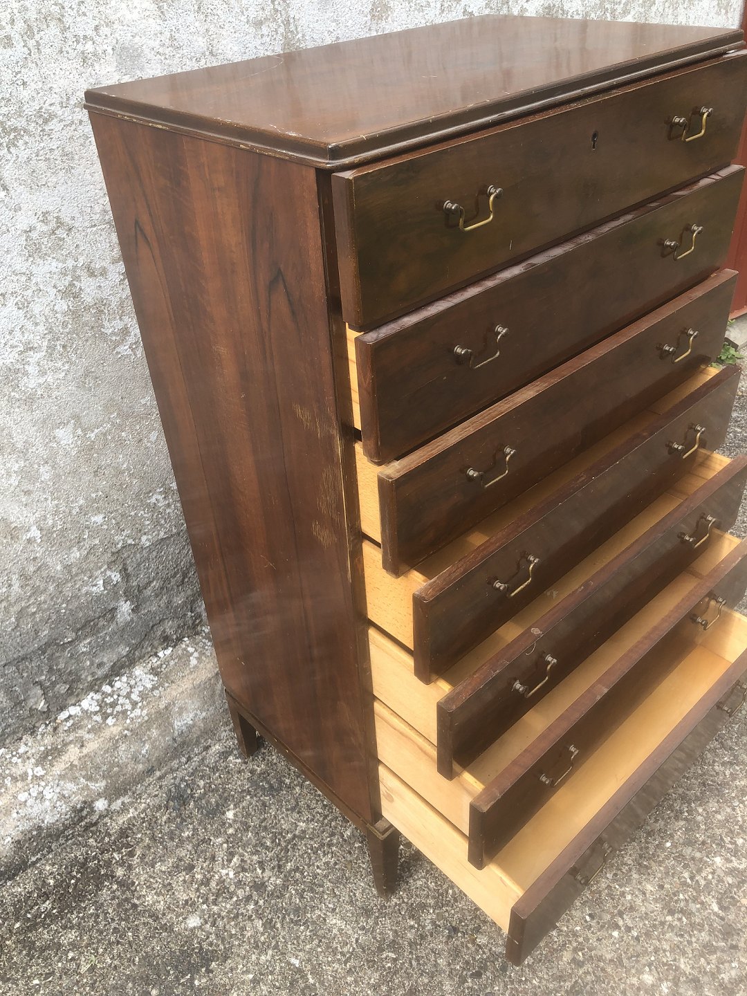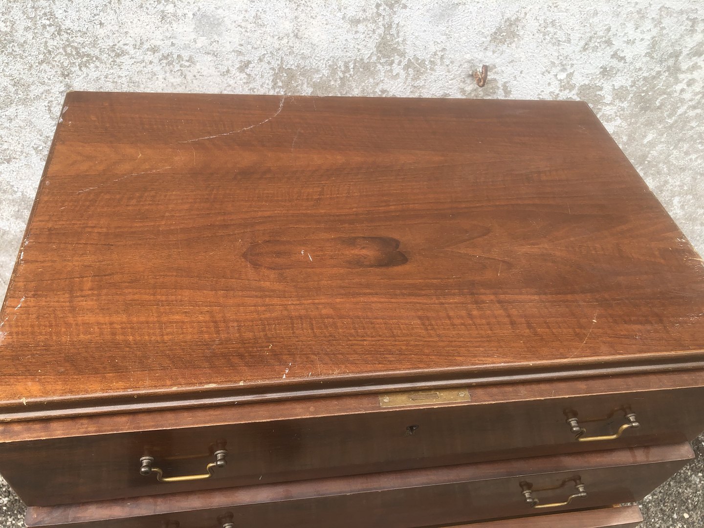 Kommode aus lackiertem Nussbaumfurnier. Alters- und Gebrauchsspuren. Abmessungen: 118 x 70 x 43 cm