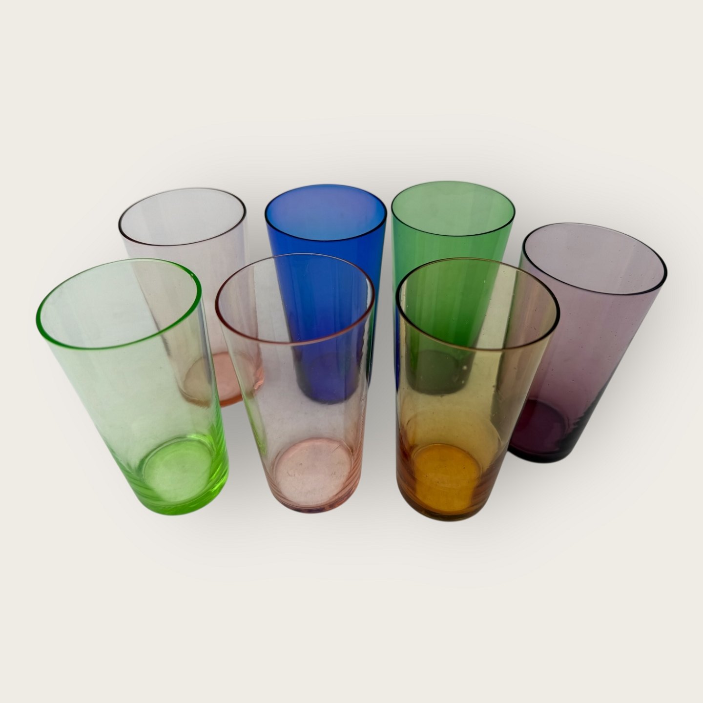 Holmegaard, Wassergläser in verschiedenen Farben, 10 cm hoch, Durchmesser 5 cm, guter Zustand. Bitte schreiben Sie in die Kommentare, welche Farbe Sie wünschen. 1 hellgrün, 2 rosa, 1 blau, 1 grün, 1 bernsteinfarben und 1 violett.