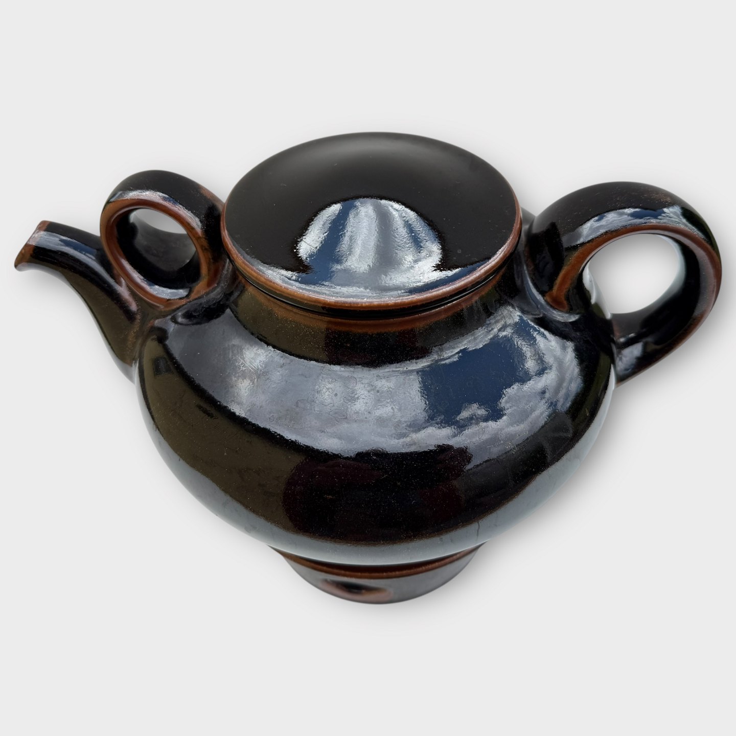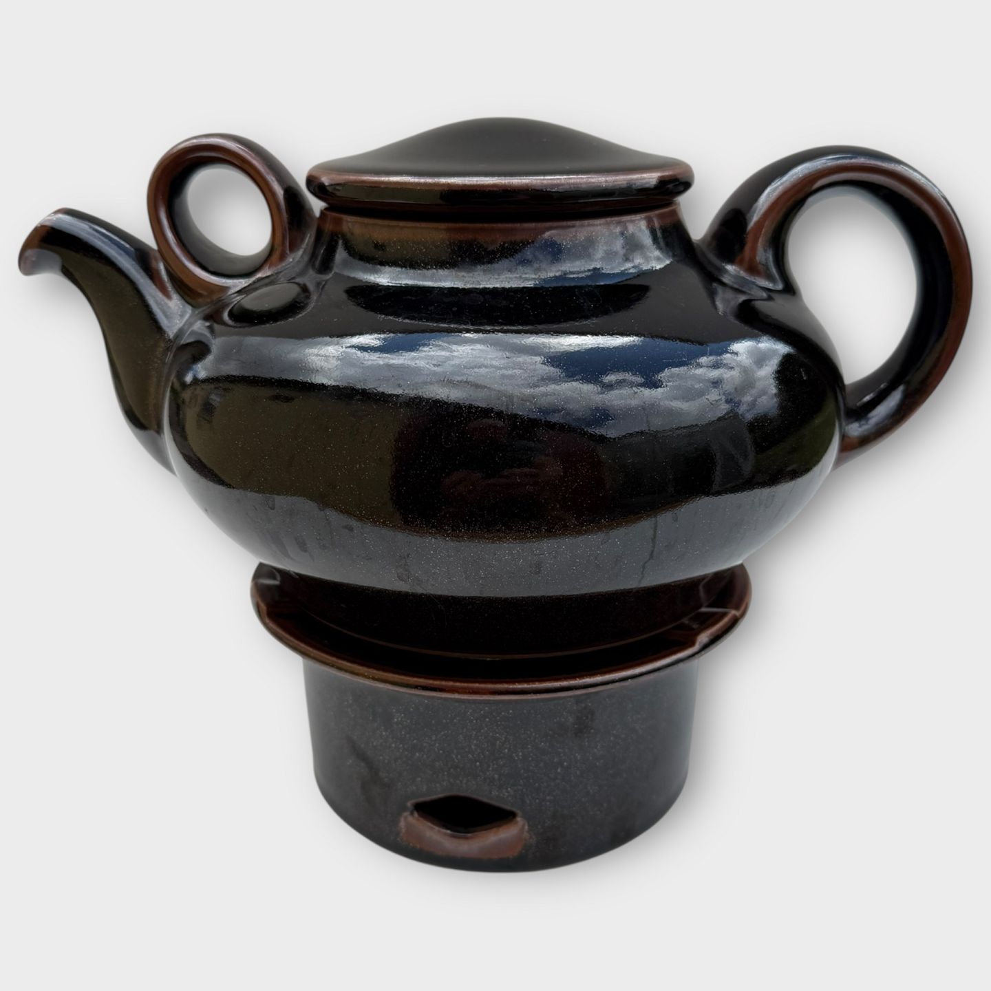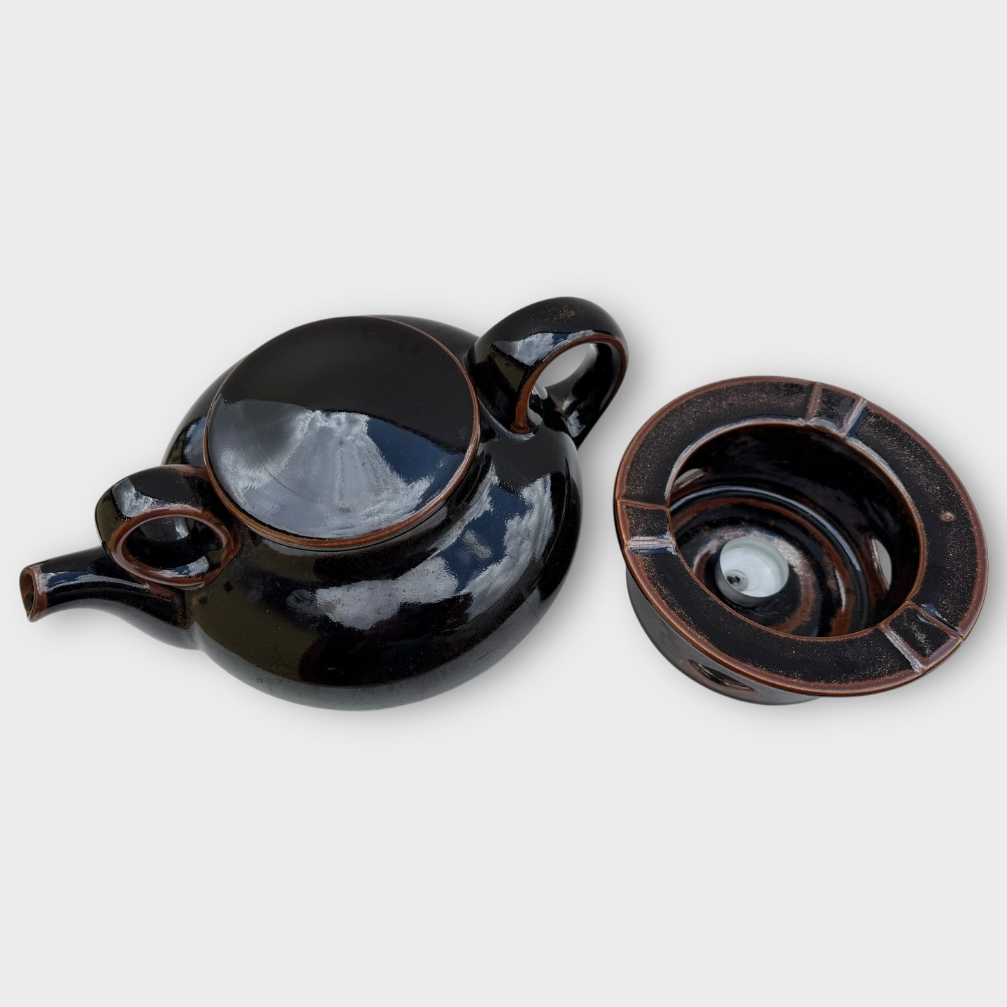 Bing & Gröndahl, große braune Teekanne mit dazugehörigem Stövchen, Design: Edith Sonne Bruun, Tinmuko-Glasur, Fassungsvermögen ca. 3 Liter, Maße: HxBxT 14x32x22cm, Stövchen 8,5cm, Durchmesser 18cm, guter Zustand