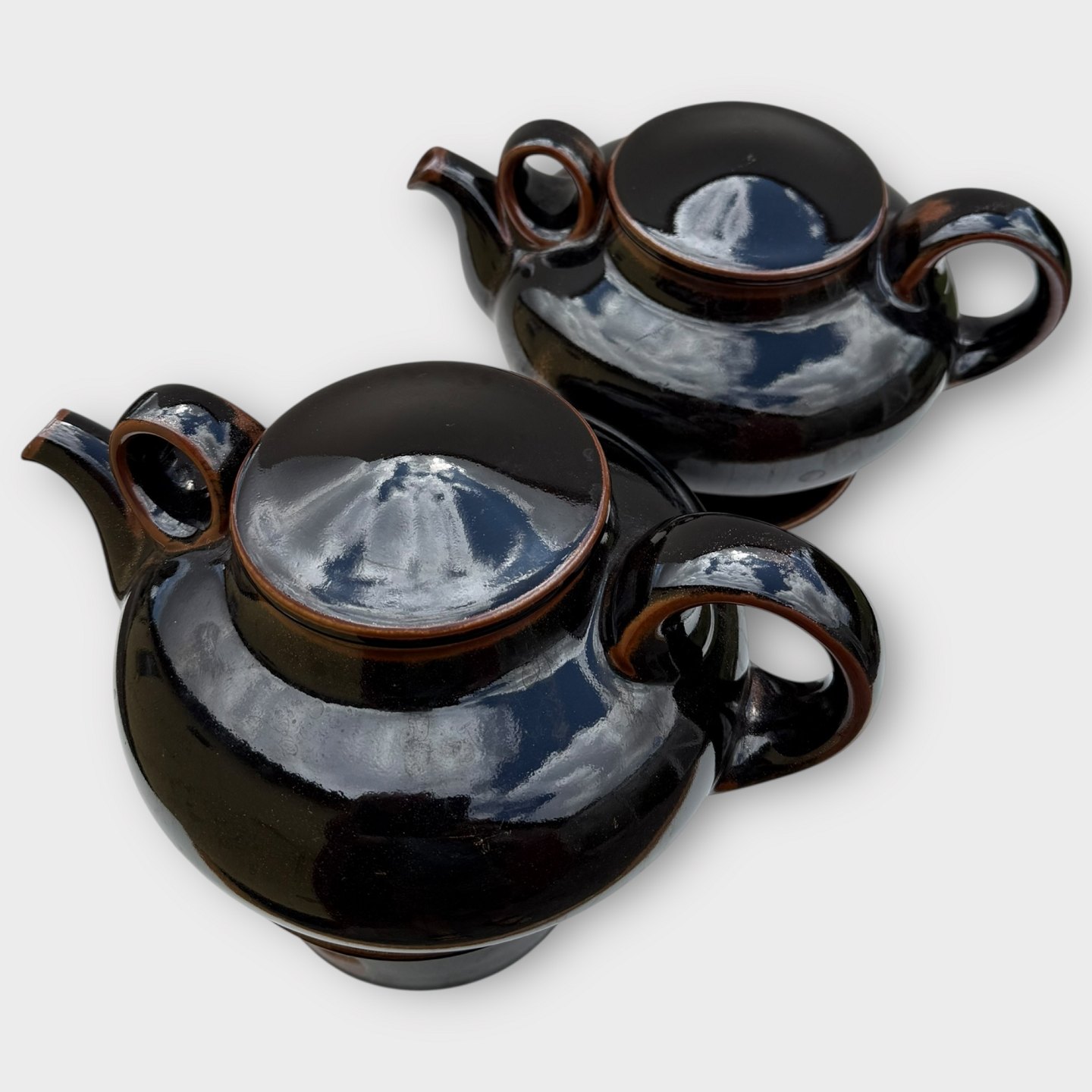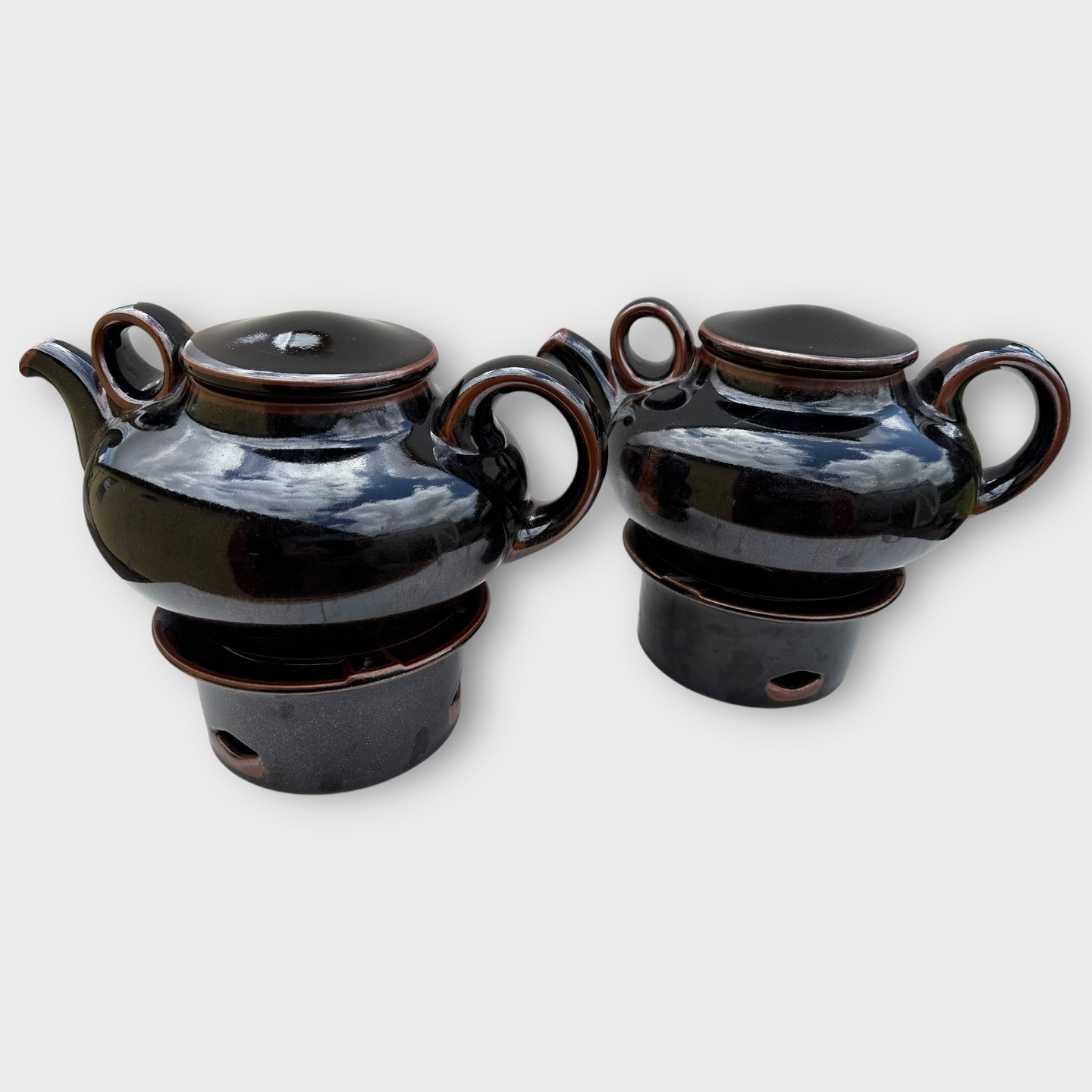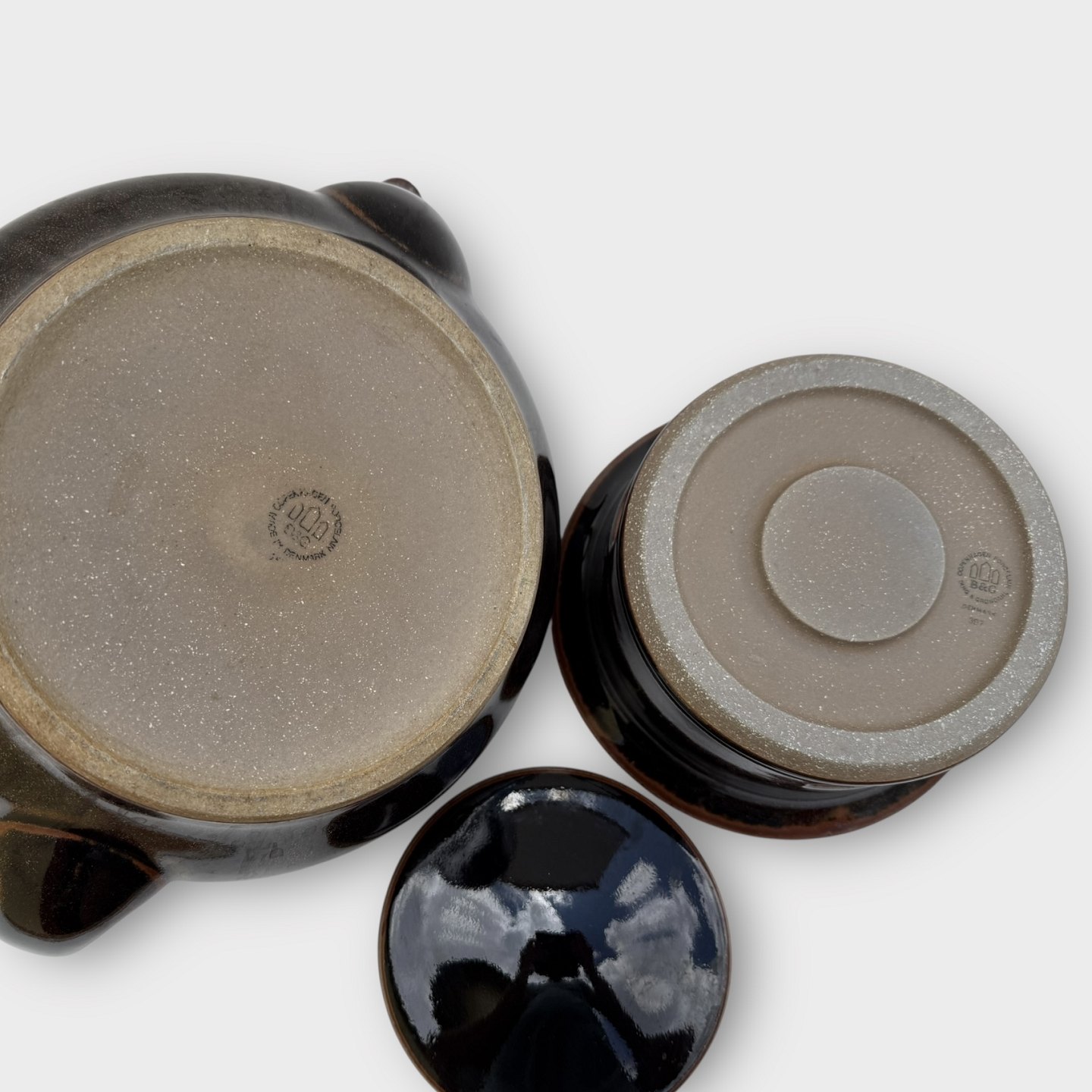 Bing & Gröndahl, große braune Teekanne mit dazugehörigem Stövchen, Design: Edith Sonne Bruun, Tinmuko-Glasur, Fassungsvermögen ca. 3 Liter, Maße: HxBxT 14x32x22cm, Stövchen 8,5cm, Durchmesser 18cm, guter Zustand