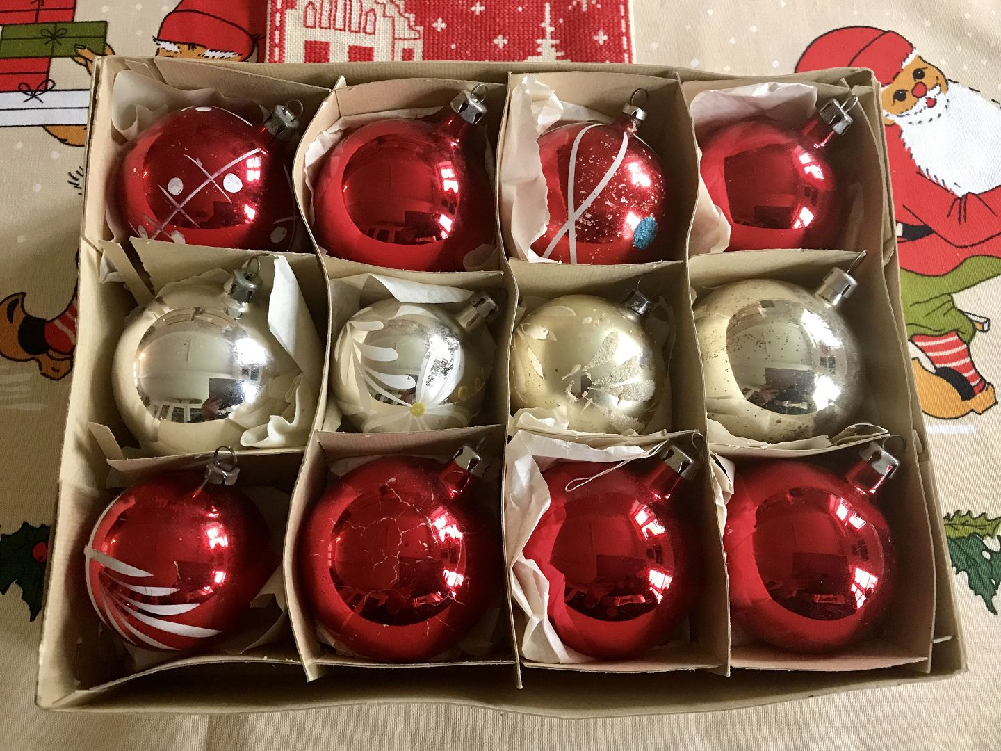 Ældre Julekugler, Æske med Røde & Sølv, 12 stk, *Charmerende Patineret*