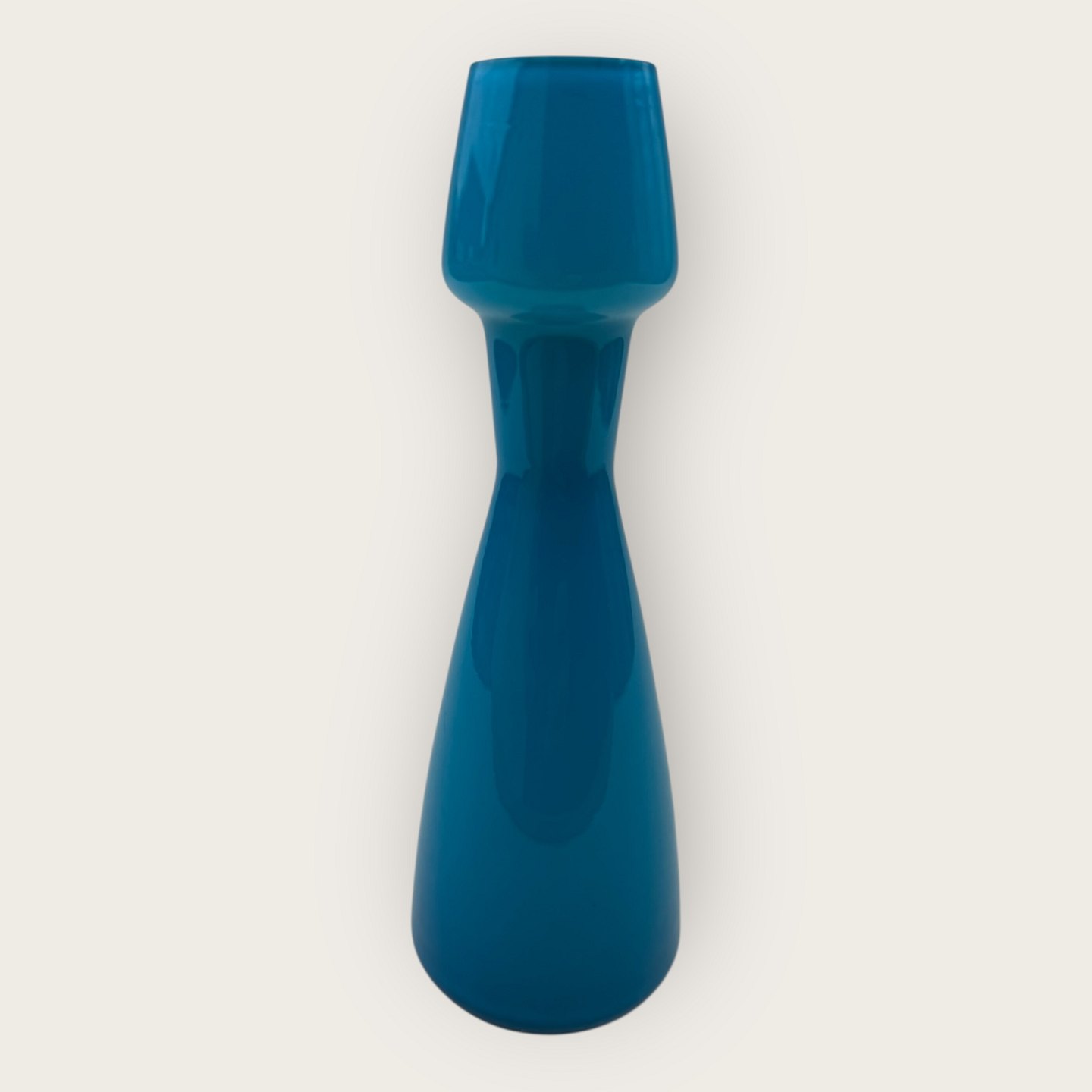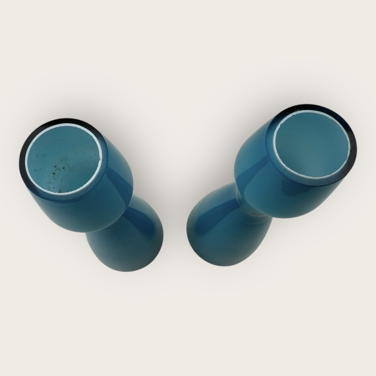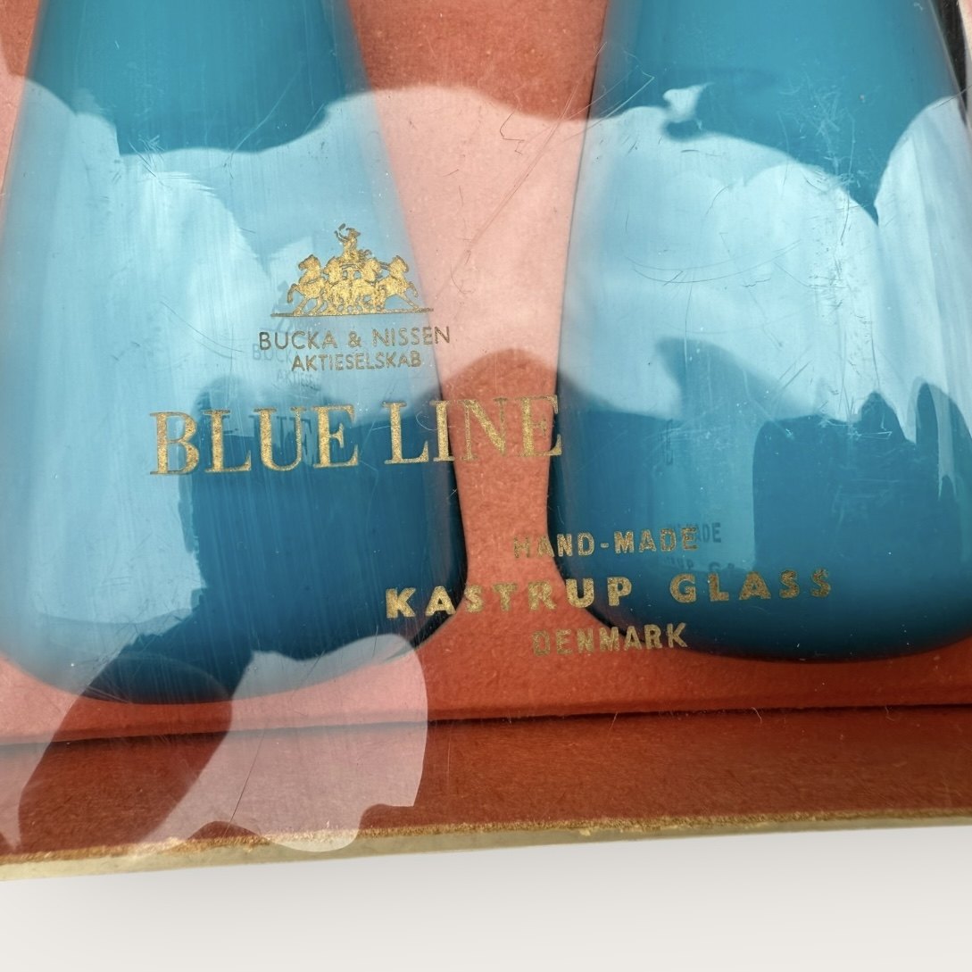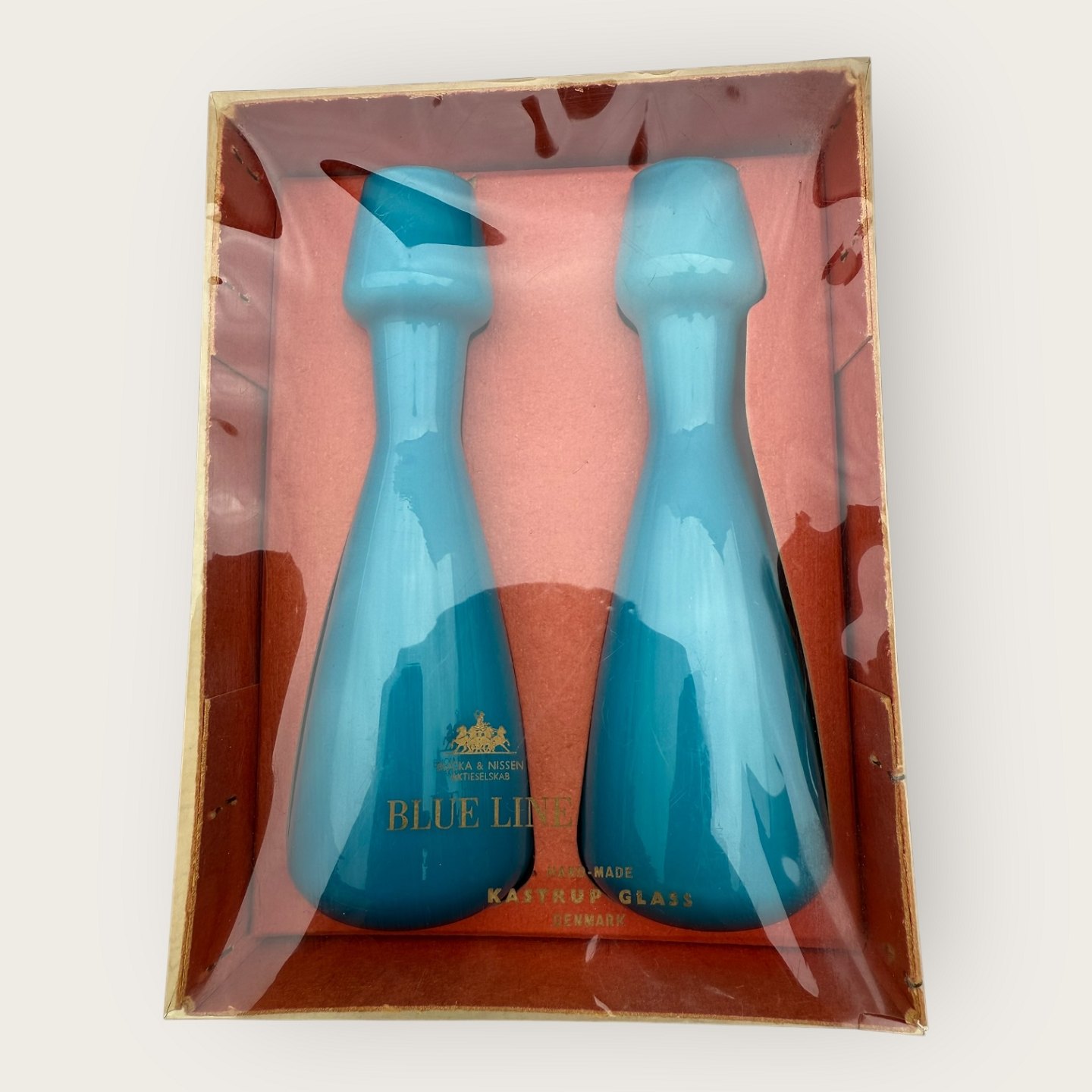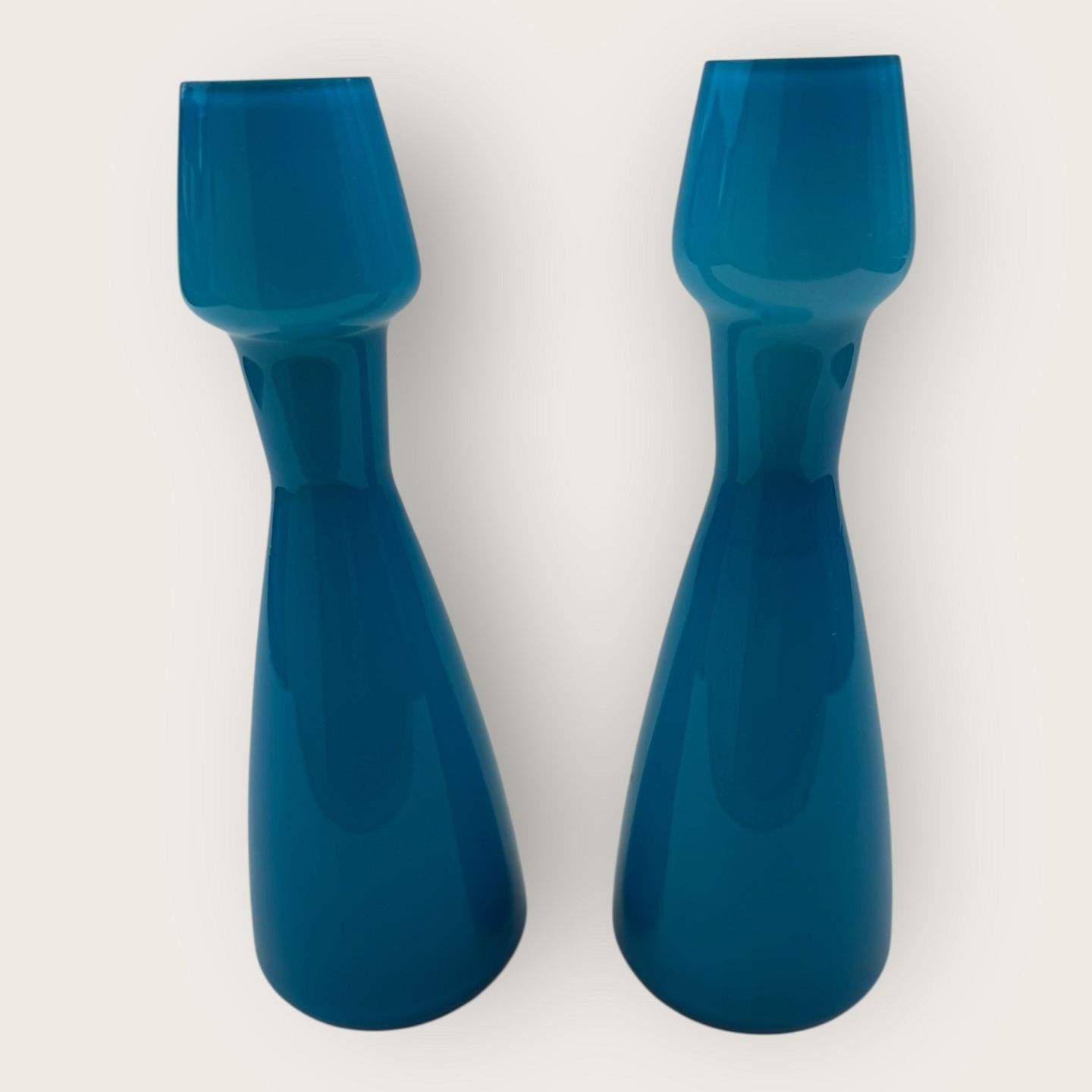 Kastrup Glasværk, Design: Jacob E. Bang, set of Blue line candlesticks in original box from Bucka & Nissen, height 17.5 cm, good condition