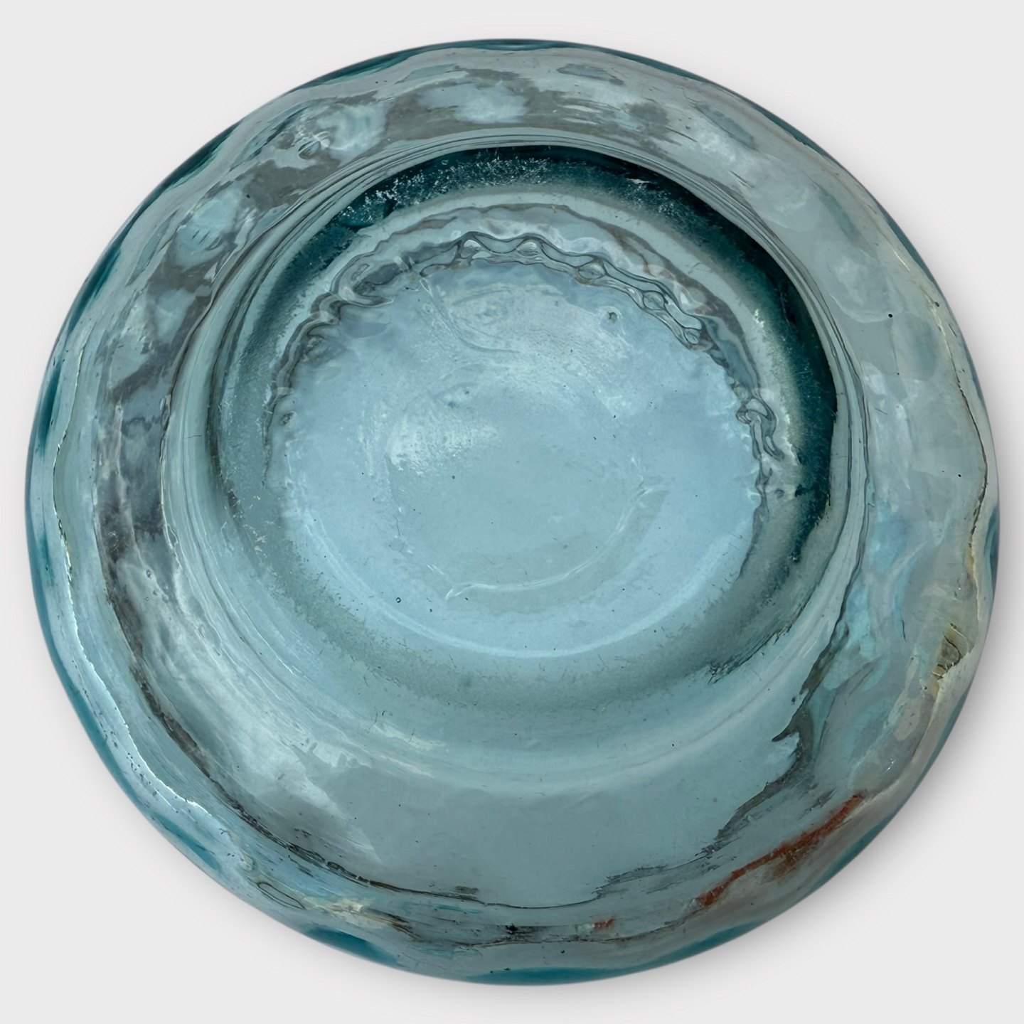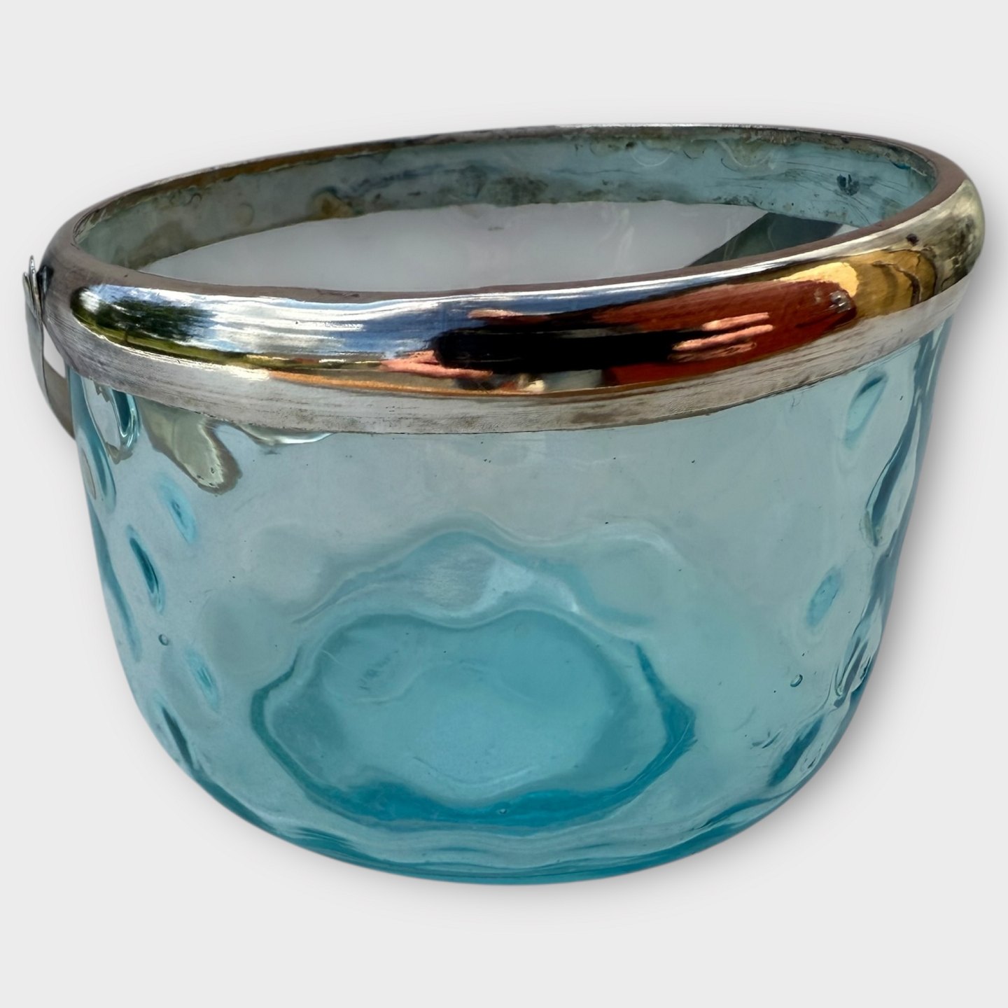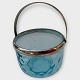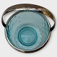 Kandis skål med metalhank, diameter 10 cm, højde 7,5cm, korpus lyseblå, optisk øjnet.