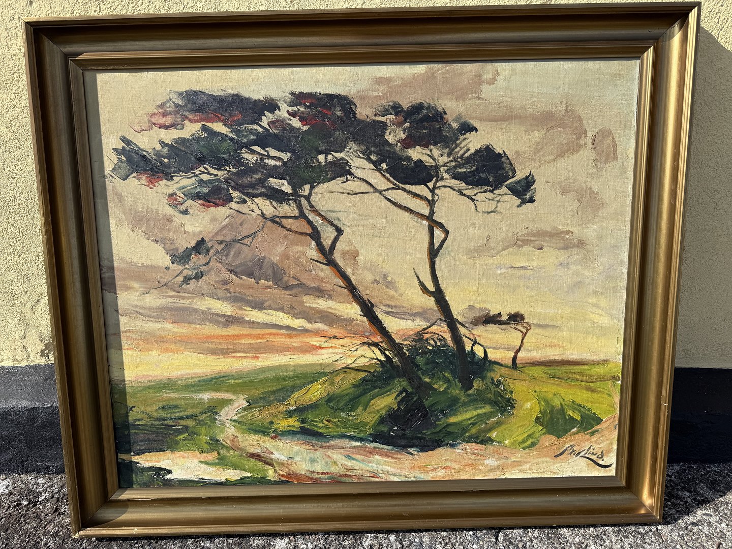 Axel Lind ( 1907-2011), Olimaleri på lærred, Forblæste træer i Vestjylland, Mål med ramme 96x79,5cm, pæn stand