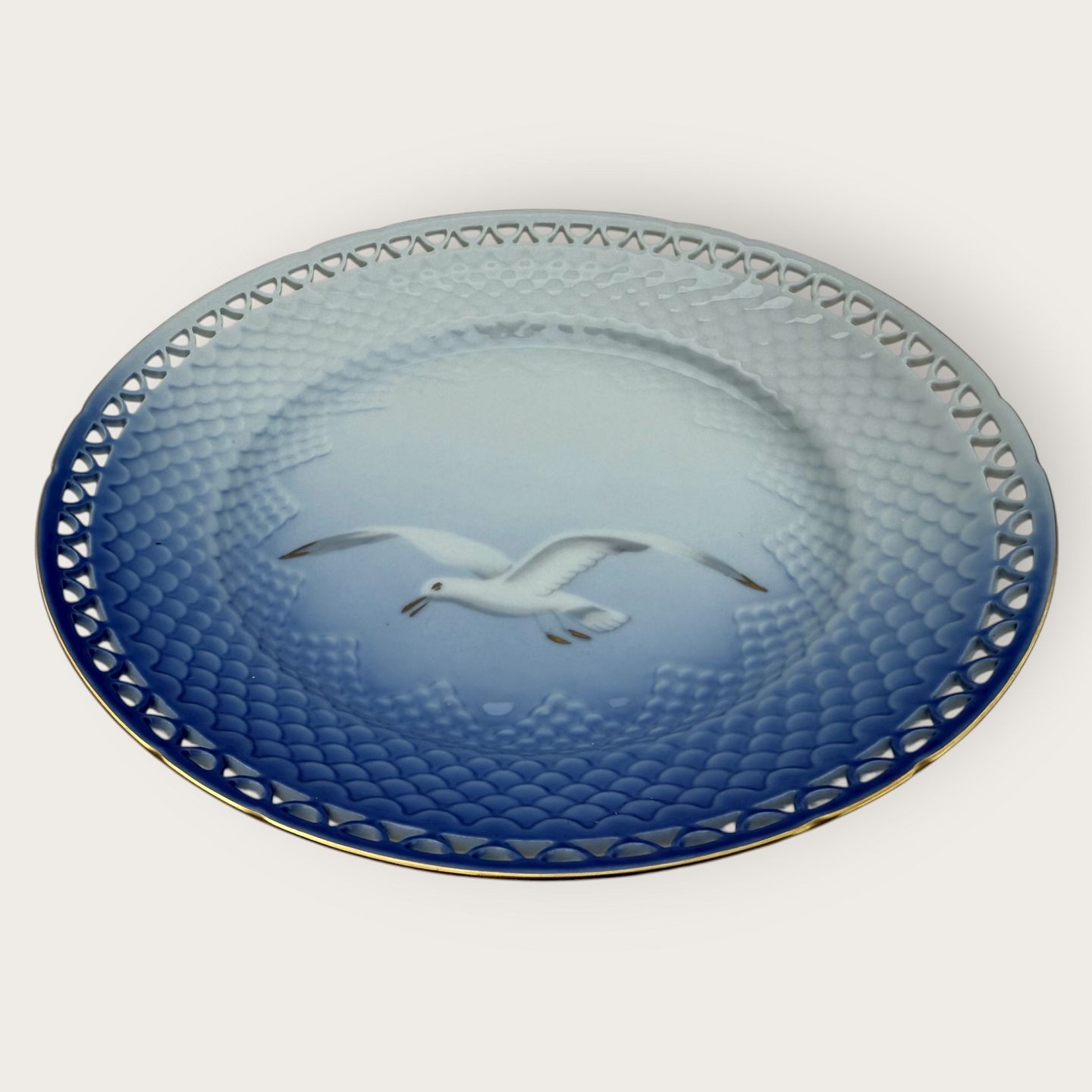 Bing & Grøndahl, Måge med guld, Frokost tallerken med gennembrudt kant #326.5, 21,5cm i diameter, Design Fanny Garde *Perfekt stand*
