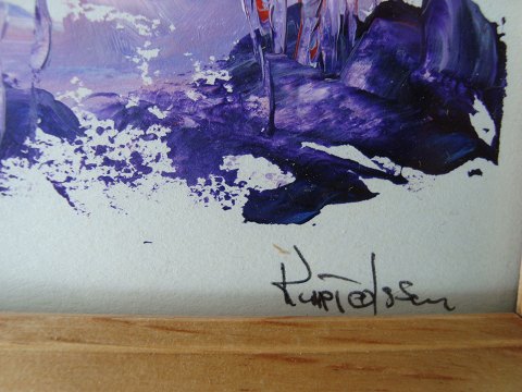 Kurt Olsson (20 årh): Klitparti i blå-lilla farver. Sign.: Kurt Olsson 14x9 (18x12½) Kurt Olsson har atelier i Jernbanegade, Aalborg.