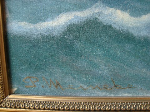 P. Weineke (20 årh): Kystparti med klippestykker, brænding og sejlskib. Olie på lærred. Sign.: P. Weineke. 29x49 (38x58)