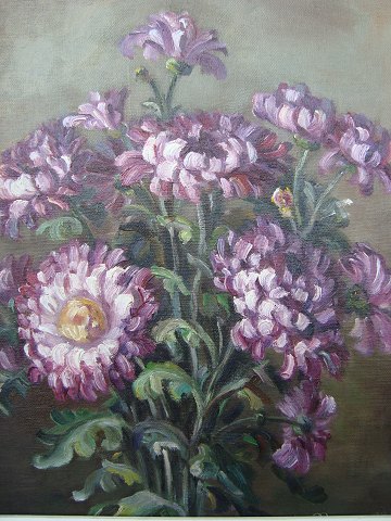 D. Bergmann (20 årh): Opstilling med lilla krysantemer. Olie på plade. Sign.: D. Bergmann (under rammekant) 32x27 (40x35)