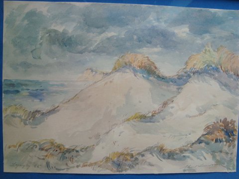 Aksel Lundgreen (1908-89): "Motiv fra Klitterne ved Lyngby vest for Svankjær nær Agger" 1955. Akvarel på papir. Sign.: Aksel Lundgreen (bly) Betegnet - "Lyngby 55" 30x42 (35x50)