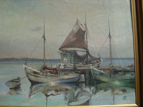 Jens Sinding Christensen (1888-1980): Fiskehuttere i havn. Olie på lærred. Sign.: Monogram JSC 64x79 (76x91)