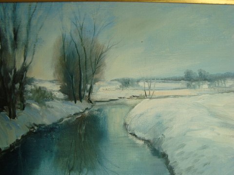 Karl Wolff (1938-2023): Vinterparti fra Køge å. Olie på lærred. Sign.: Karl Wolff. Bagpå - Køge Å - Karl Wolff. Indrammet i pæn guldramme. 30x40 (44x54)