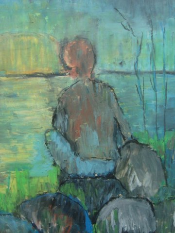 Jørgen Wadmann Pedersen (20 årh): Siddende dreng på stene ved havet og solnedgang 1962. Gouache på papir. Sign.: Jørgen Wadmann - 62. 35x26 (49x39)