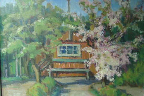 Eiler Løndal (1887-1971): Haveparti med hus, bænk og blomstrende frugttræer 1949. Olie på lærred. Sign.: Eiler Løndal - 49. 48x60 (51x63)